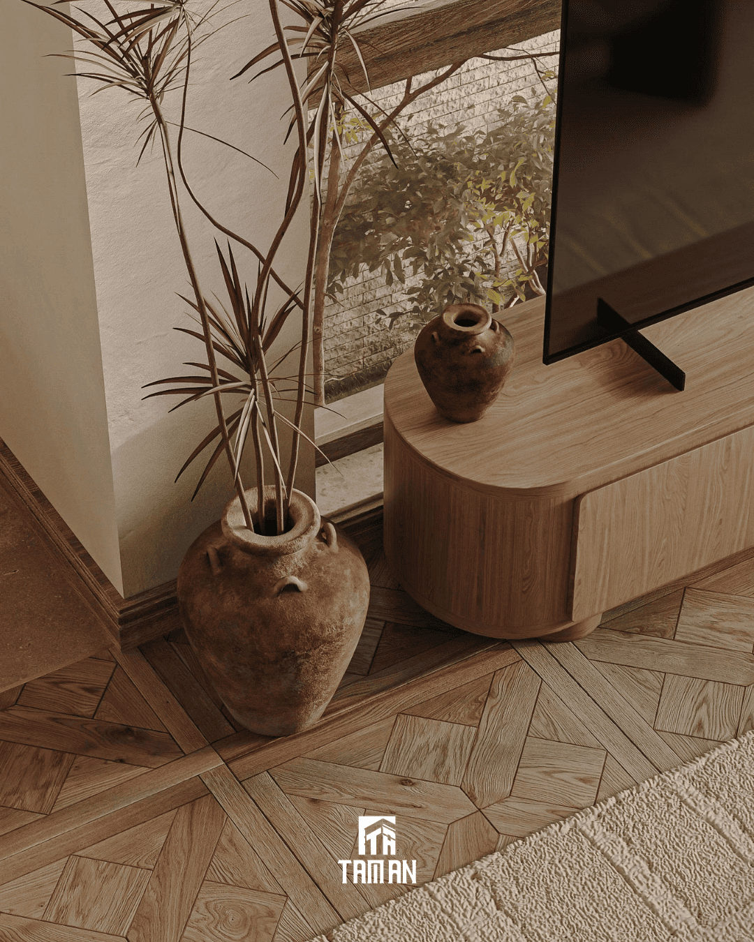 Vật liệu nội thất ưu tiên các dòng gỗ tự nhiên có tone màu ấm, giữ lại đường vân và các đặc tính nguyên bản. Bàn trà, bàn ăn và hệ thống tủ kệ đều có thiết kế tinh giản với các cạnh bo tròn theo ngôn ngữ Organic. Sàn nhà là sự phối hợp giữa gỗ lát xương cá cổ điển và sàn bê tông mài, giúp phân định không gian một cách ước lệ mà không cần vách ngăn. Các chi tiết như quạt trần dáng lá hay đèn vải thả trần không chỉ đảm bảo công năng mà còn đóng vai trò là những điểm nhấn bổ trợ cho tổng thể thô mộc.