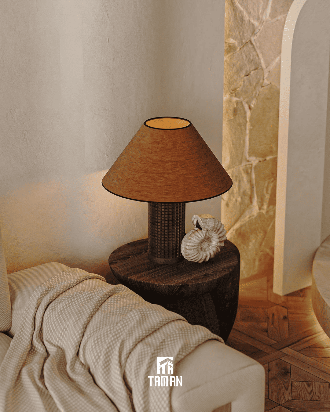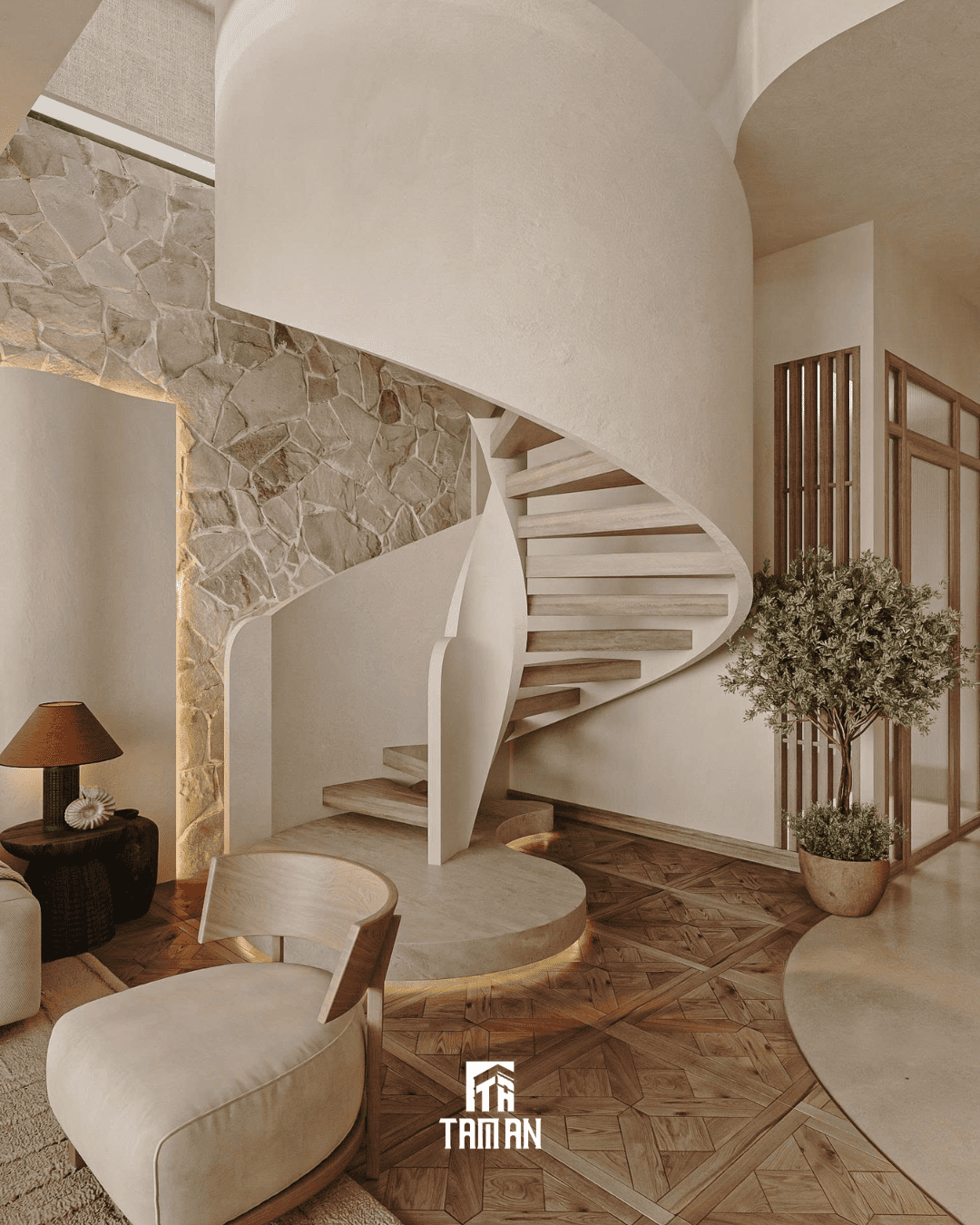 Điểm nổi bật đầu tiên là việc ứng dụng hệ tường cong xuyên suốt các khu vực chức năng. Các vách ngăn được bo tròn mềm mại kết hợp với sơn hiệu ứng màu beige lì, giúp xóa bỏ các góc cạnh sắc nhọn và điều tiết ánh sáng dàn trải đều hơn. Điểm nhấn thị giác mạnh nhất nằm ở các mảng đá rối tự nhiên được ốp sát trần và các diện tường chính. Việc giữ nguyên bề mặt xù xì, không đồng nhất của đá là cách ứng dụng triết lý Wabi-sabi vào thực tế, tạo nên sự tương phản rõ rệt với bề mặt tường phẳng mịn bên dưới.