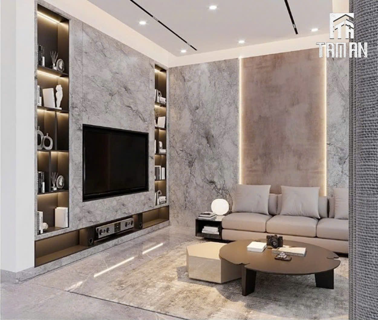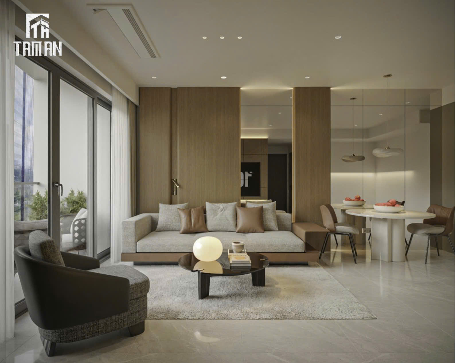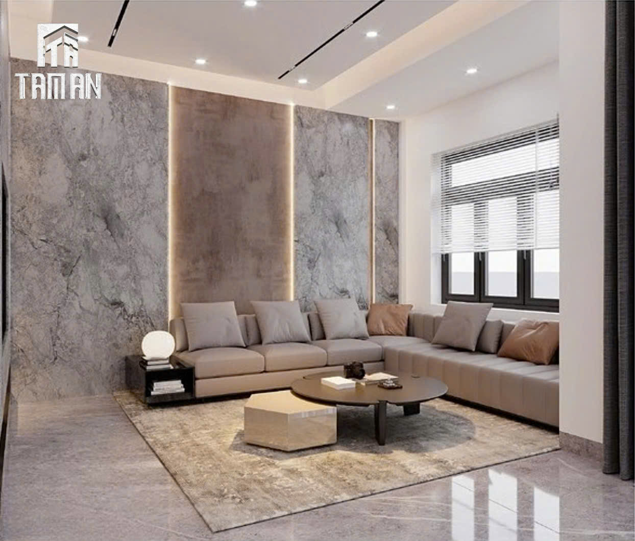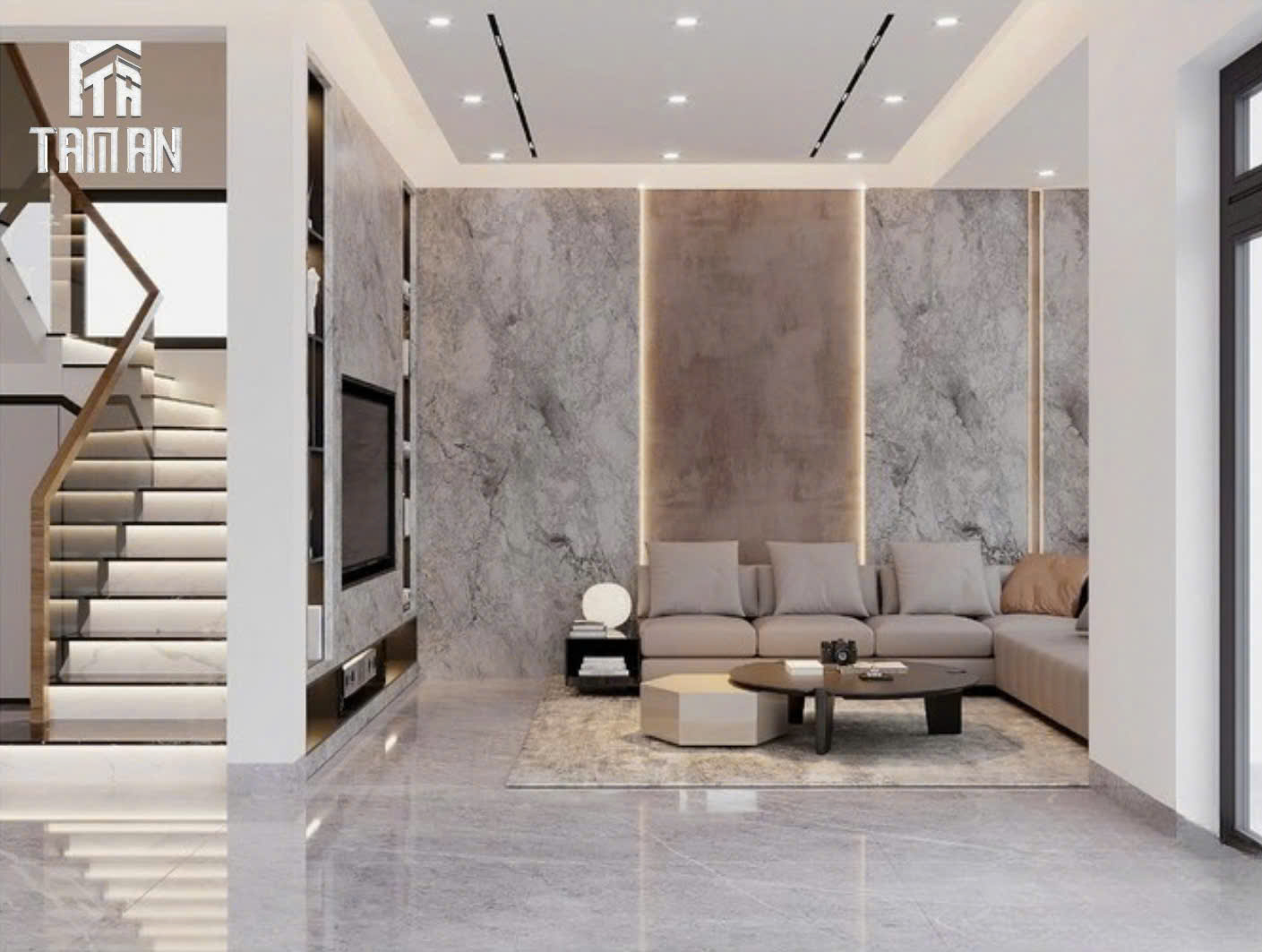 Màu sắc chủ đạo là các gam trung tính như trắng, xám, be, kết hợp điểm nhấn từ nội thất hoặc vật dụng trang trí để tạo chiều sâu cho không gian. Nội thất được lựa chọn theo tiêu chí đa năng – tinh gọn – thẩm mỹ cao, tiêu biểu như sofa hiện đại, bàn trà đơn giản, kệ tivi thiết kế treo hoặc âm tường.