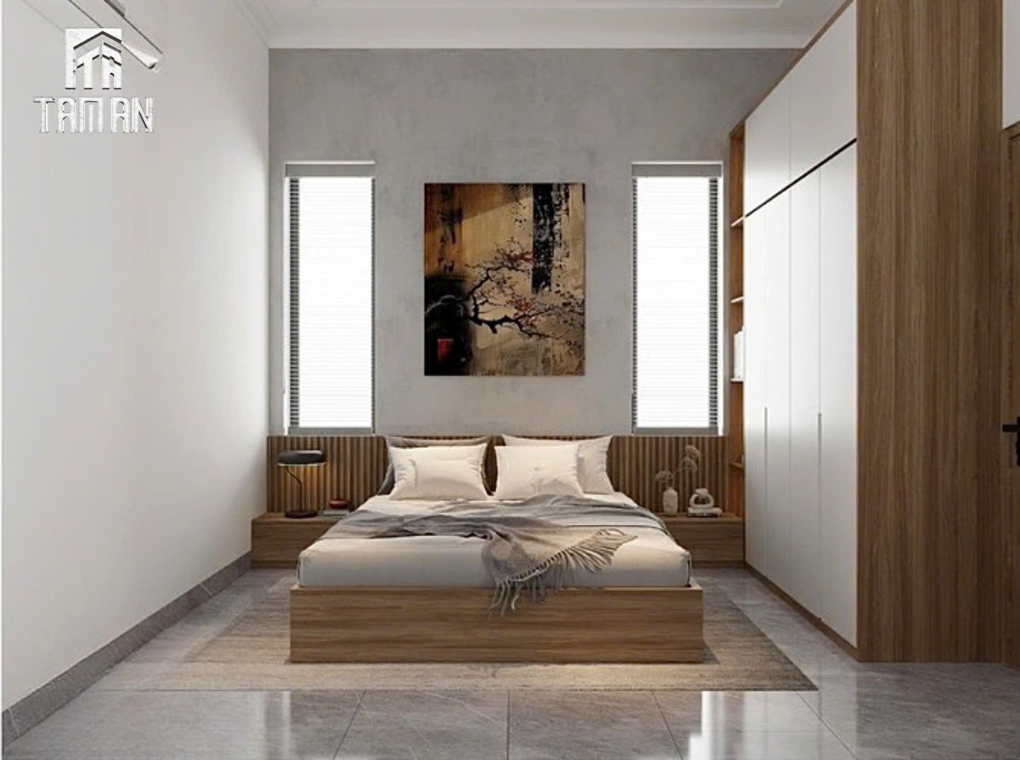 Màu sắc chủ đạo là các gam trung tính như trắng, xám, be hoặc màu gỗ, kết hợp ánh sáng dịu nhẹ để mang lại cảm giác ấm áp. Nội thất phòng ngủ được bố trí khoa học, bao gồm giường ngủ, tủ quần áo, bàn trang điểm hoặc bàn làm việc, đáp ứng đầy đủ nhu cầu sinh hoạt nhưng vẫn đảm bảo sự gọn gàng.