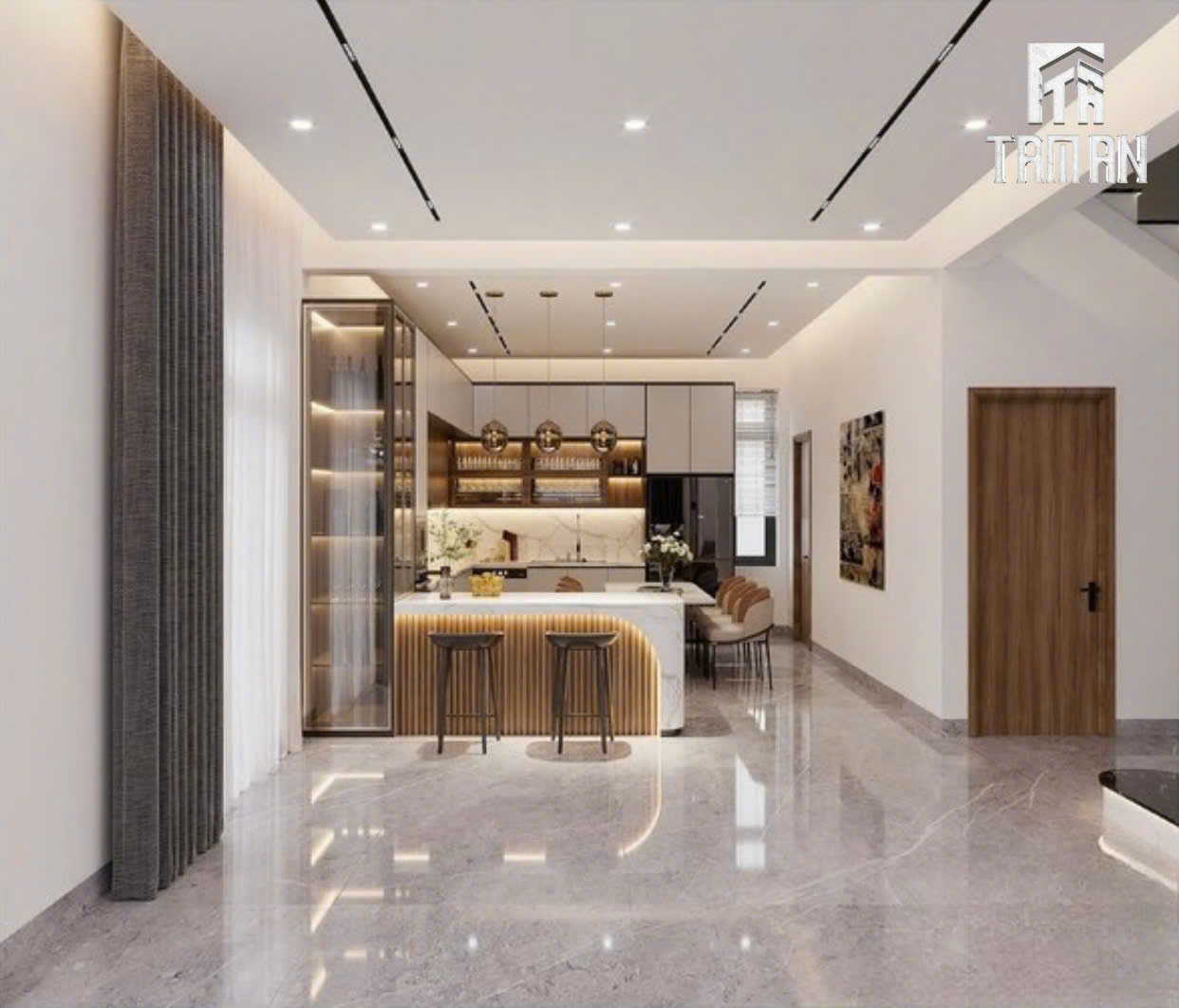 Khu vực nhà ăn được bố trí liền kề, tạo sự kết nối giữa các thành viên trong gia đình. Bàn ăn thiết kế đơn giản, ghế ngồi thoải mái, kết hợp ánh sáng ấm áp từ đèn thả trần, mang lại cảm giác ấm cúng và hiện đại cho không gian sinh hoạt chung.