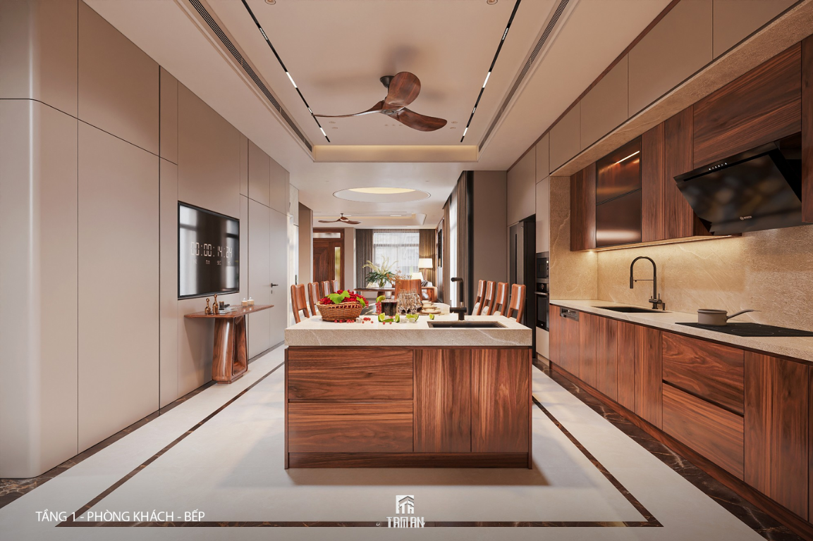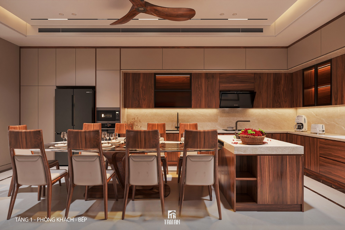 Khu bếp được thiết kế theo nguyên tắc tối ưu công năng – thuận tiện sử dụng – dễ vệ sinh. Hệ tủ bếp cao kịch trần giúp tăng không gian lưu trữ, vật liệu chống ẩm, chống mối mọt phù hợp khí hậu miền Bắc. Khu vực bàn ăn bố trí khoa học, tạo cảm giác ấm áp cho những bữa cơm gia đình.