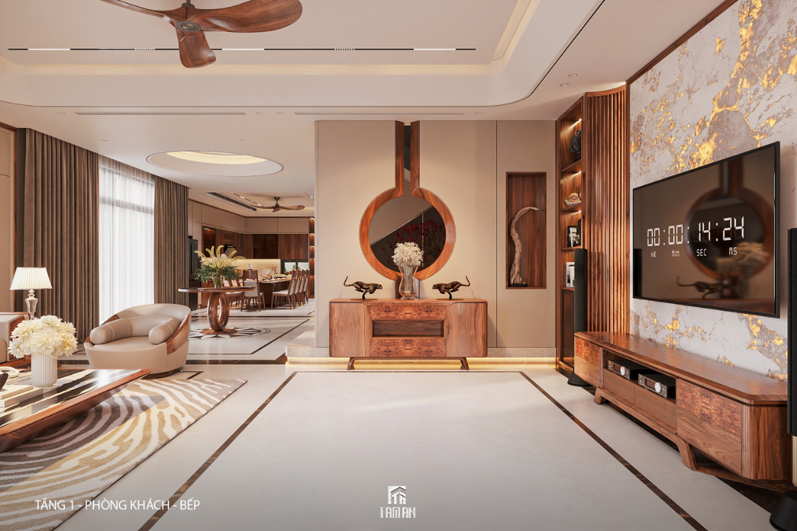 Phòng khách được thiết kế với bố cục mở, tạo sự kết nối liền mạch giữa các không gian. Tone màu trung tính kết hợp vật liệu gỗ công nghiệp cao cấp, đá và ánh sáng gián tiếp giúp không gian vừa ấm cúng vừa đẳng cấp. Toàn bộ nội thất được thi công đúng bản vẽ, đường nét sắc sảo, hoàn thiện tinh tế.
