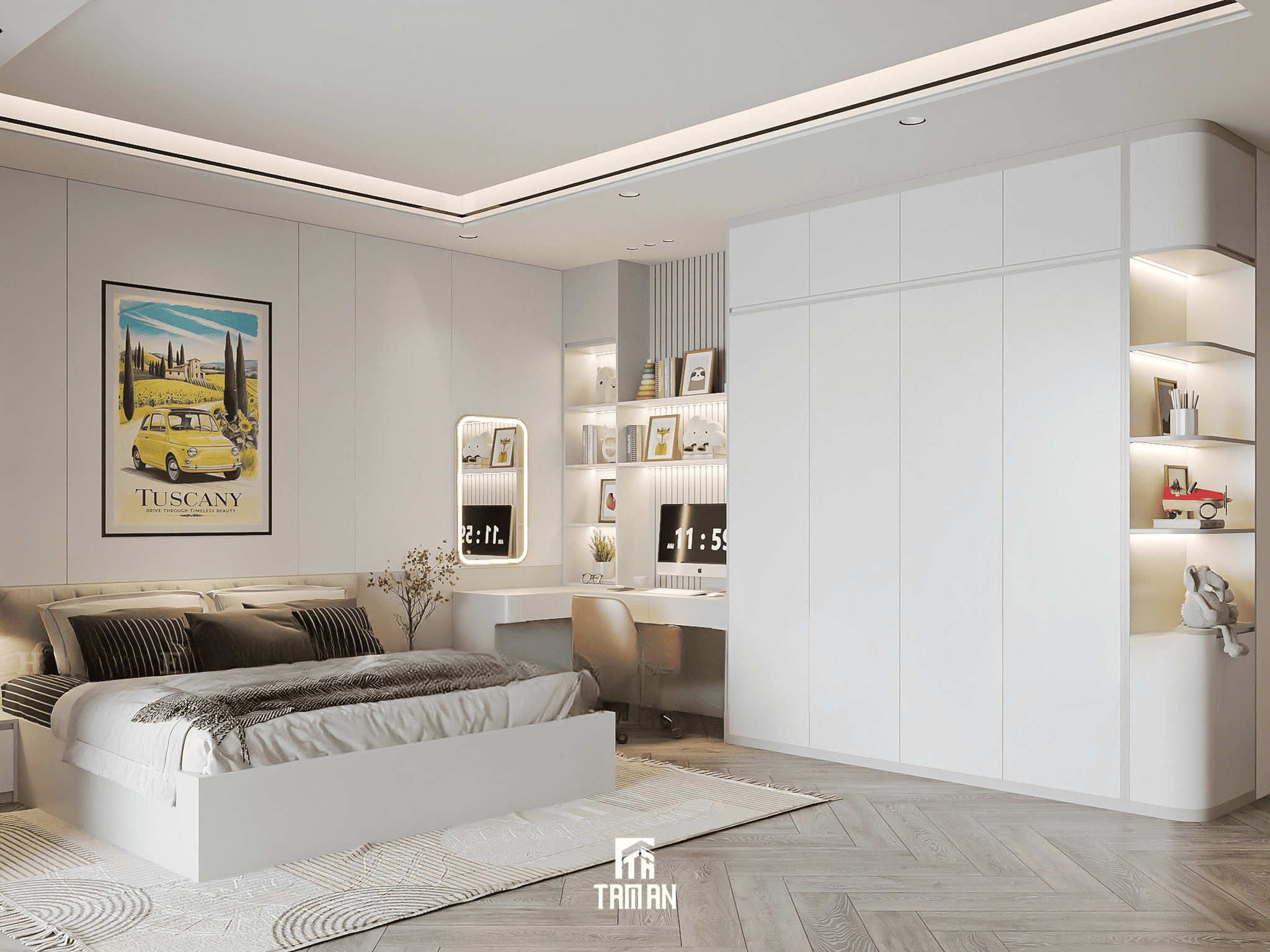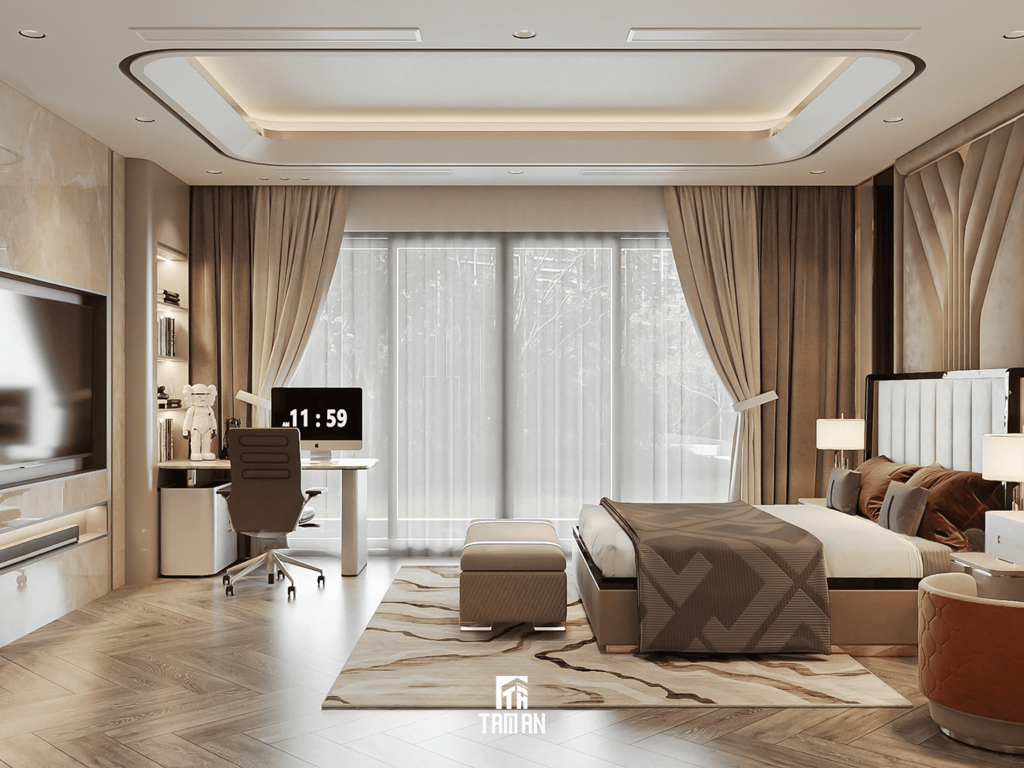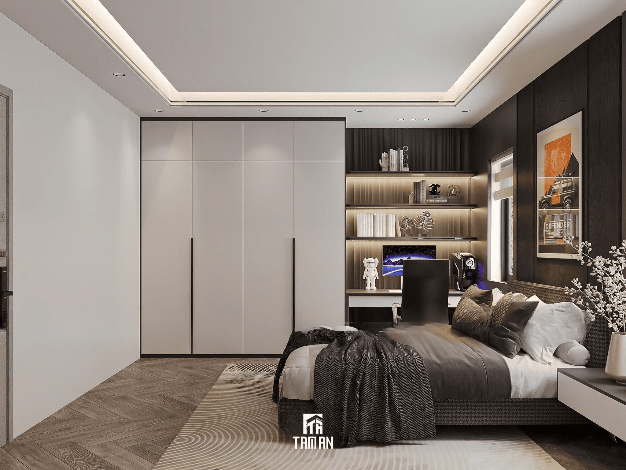 Phòng ngủ là không gian riêng tư được chăm chút tỉ mỉ nhất. Vách đầu giường bọc nệm cao cấp với họa tiết hình học đối xứng tạo điểm tựa vững chãi và êm ái. Sự xuất hiện của các tông màu trầm ấm như nâu đất, kem và gỗ tự nhiên giúp không gian trở nên thư thái hơn.