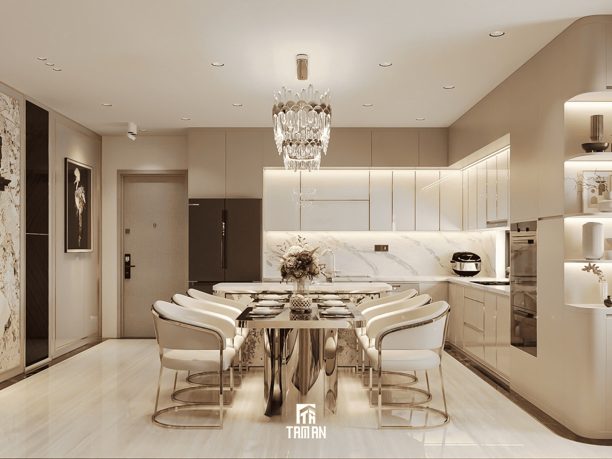 Khu vực bếp trong mẫu thiết kế này được tối ưu hóa theo hướng hiện đại nhưng không làm mất đi tinh thần sang trọng. Hệ tủ bếp kịch trần với bề mặt cánh kính và acrylic bóng gương tạo nên sự sạch sẽ và đẳng cấp.
