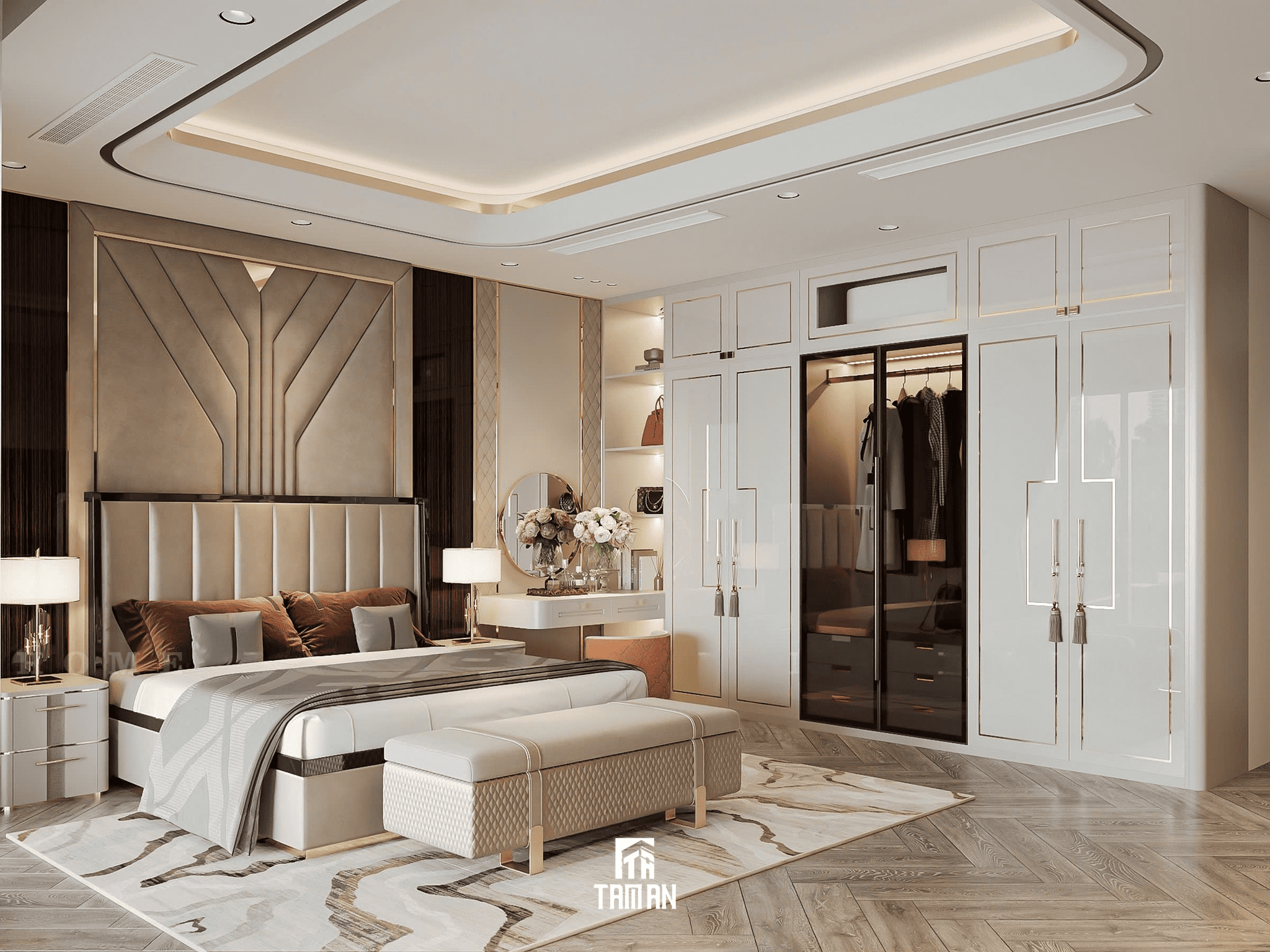 Hệ tủ quần áo cánh kính mờ kết hợp đèn cảm ứng là chi tiết không thể thiếu trong các mẫu nội thất phong cách Luxury hiện nay, giúp gia chủ dễ dàng quản lý kho đồ hiệu và trang sức một cách chuyên nghiệp như trong các showroom cao cấp.