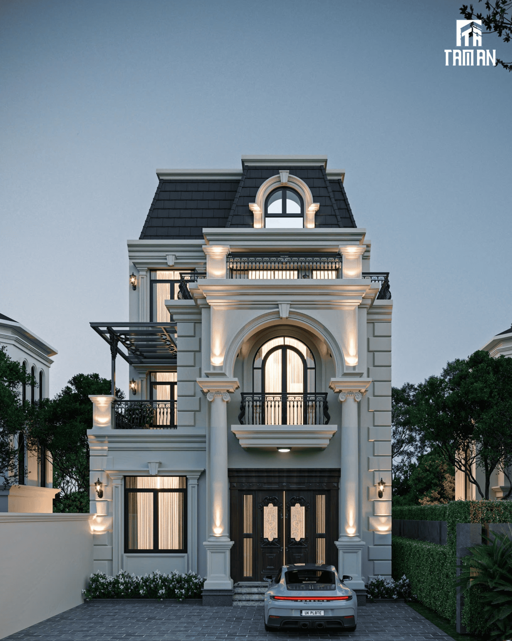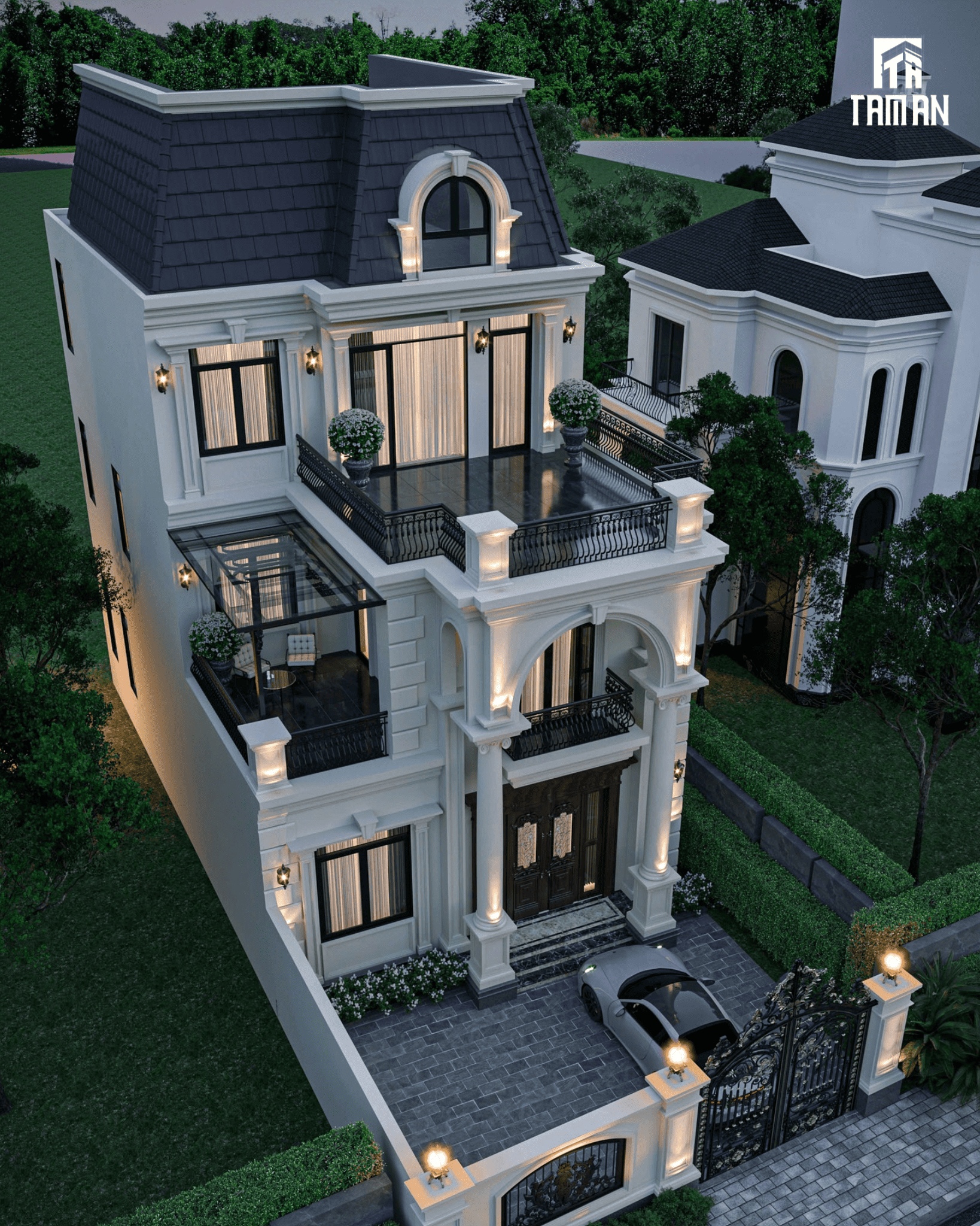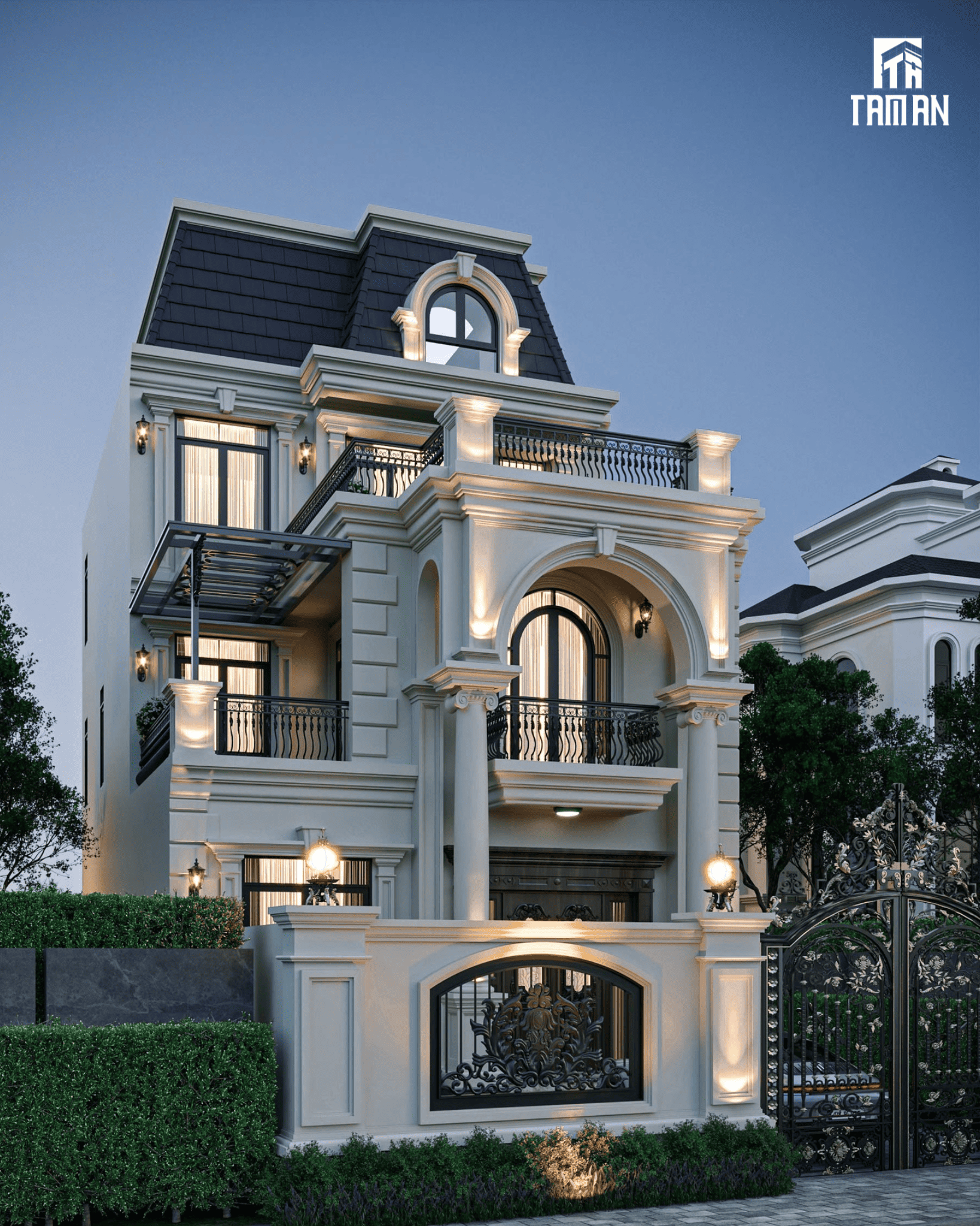 Ngôi biệt thự tại Hoài Đức hiện lên như một bức tranh kiến trúc diễm lệ, nơi thời gian dường như ngưng đọng để tôn vinh vẻ đẹp vượt thời gian của phong cách Tân cổ điển. Sự kết hợp tinh tế giữa những đường nét phào chỉ tỉ mỉ, uyển chuyển với gam màu trắng tinh khôi đã tạo nên một tổng thể vừa sang trọng, quý phái, vừa đầy sức sống. Hệ cột trụ lộng lẫy nâng đỡ vòm cửa hình bán nguyệt như một lời chào uy nghi, đưa ta vào một thế giới xa hoa nhưng cũng vô cùng ấm cúng.Từng chi tiết lan can sắt nghệ thuật được uốn lượn như những nét vẽ tài hoa, làm tăng thêm vẻ kiêu sa và lãng mạn cho các ban công. Mái Mansard đặc trưng với tông màu xanh đen như một chiếc vương miện quyền uy, hoàn thiện diện mạo lộng lẫy của công trình. Dưới ánh sáng vàng lung linh được bố trí khéo léo, ngôi nhà như một viên ngọc quý tỏa sáng, khơi gợi những cảm xúc bình yên và ngưỡng mộ trong lòng mỗi người khi ngắm nhìn.