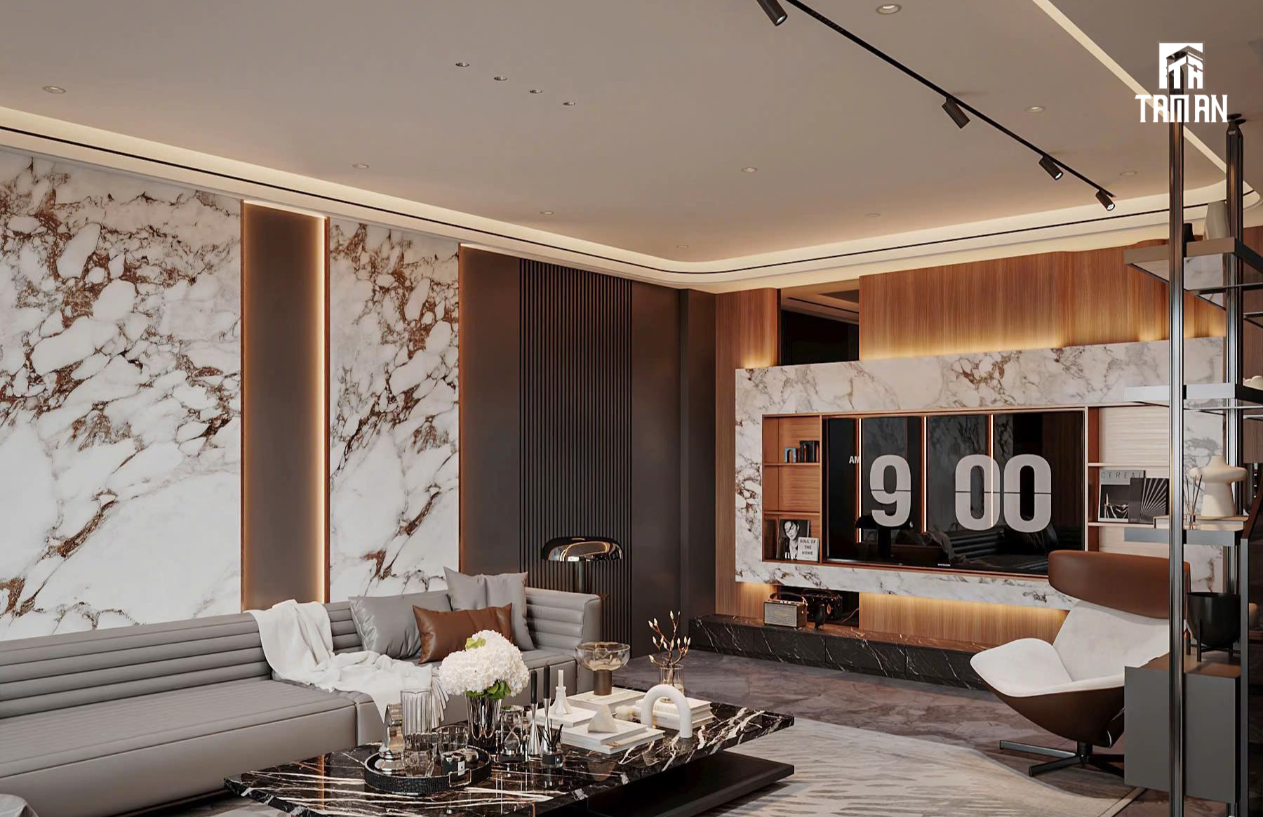Ngay khi bước vào, ấn tượng đầu tiên chính là sự tối giản trong đường nét nhưng lại cực kỳ phong phú về chất liệu. Phong cách hiện đại ở đây không đồng nghĩa với sự đơn điệu, mà là một sự chắt lọc tinh hoa, nơi mỗi chi tiết đều mang một ý nghĩa thẩm mỹ riêng. Sự sang trọng được nâng tầm qua cách lựa chọn và phối hợp vật liệu đầy nghệ thuật. Những mảng tường đá marble trắng với vân mây nâu xám uốn lượn tự nhiên, đối lập mạnh mẽ với các tấm ốp gỗ màu nâu trầm ấm áp, tạo nên một trò chơi thị giác đầy thú vị.