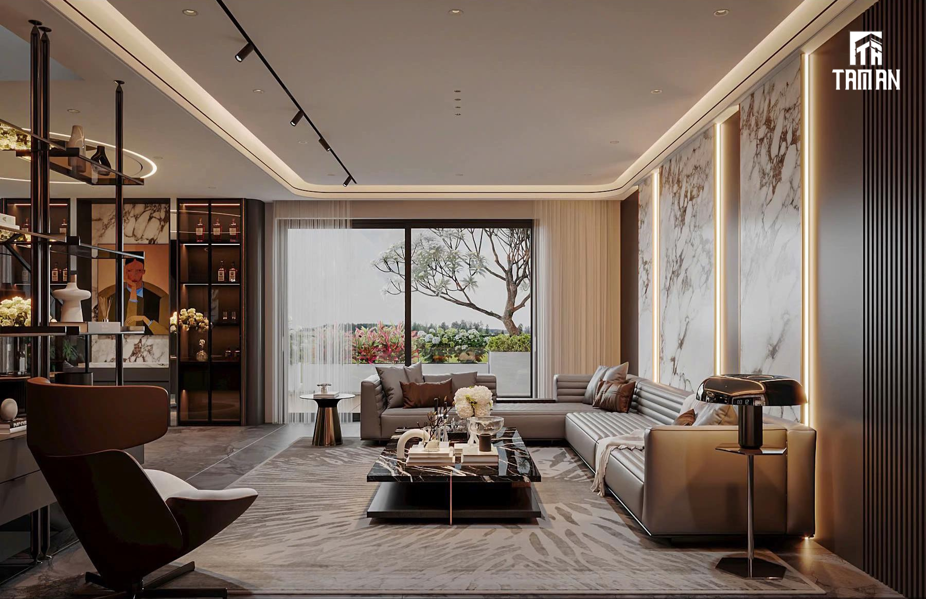 Việc bố trí không gian theo lối mở, kết nối liền mạch phòng khách với khu vực ban công xanh mát là một đặc điểm cốt lõi, giúp tối đa hóa diện tích và tạo sự thông thoáng. Bài trí đồ trang trí cũng tuân thủ nguyên tắc “ít nhưng chất”, với những cuốn sách nghệ thuật, bình hoa tinh tế, tất cả quyện hòa để kiến tạo nên một không gian sống đẳng cấp.