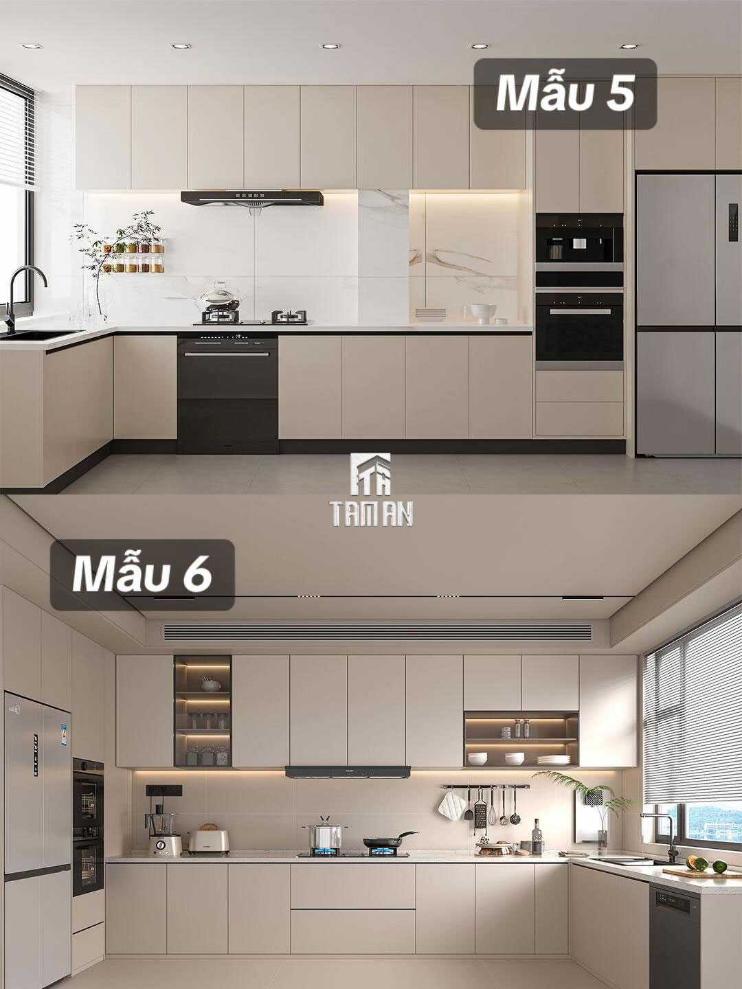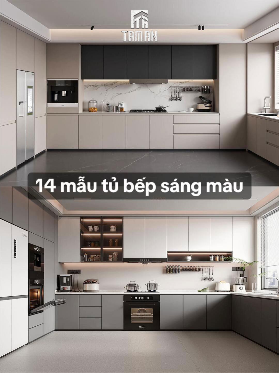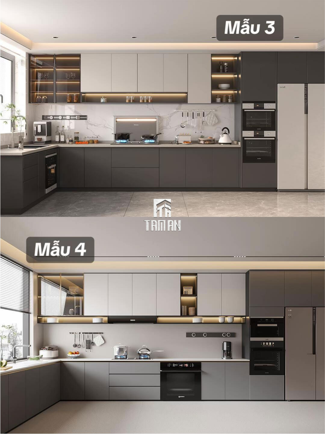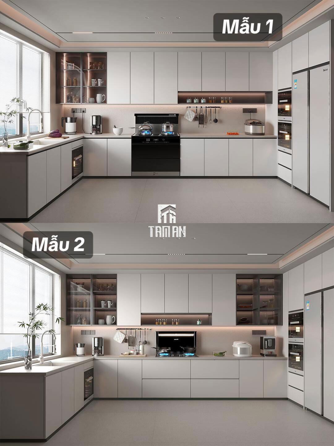 Không gian bếp là trái tim của căn hộ, nơi thể hiện rõ nét nhất tư duy thiết kế thông minh và công năng thực tiễn của Tâm An – Chuyên thiết kế thi công nội thất trọn gói. Tủ bếp được làm từ MDF lõi xanh chống ẩm, phủ laminate xám tro sang trọng, giúp chống bám bụi và dễ vệ sinh. Hệ tủ trên cao được thiết kế tới trần, tăng tối đa diện tích lưu trữ – giải pháp lý tưởng cho căn hộ thành thị.