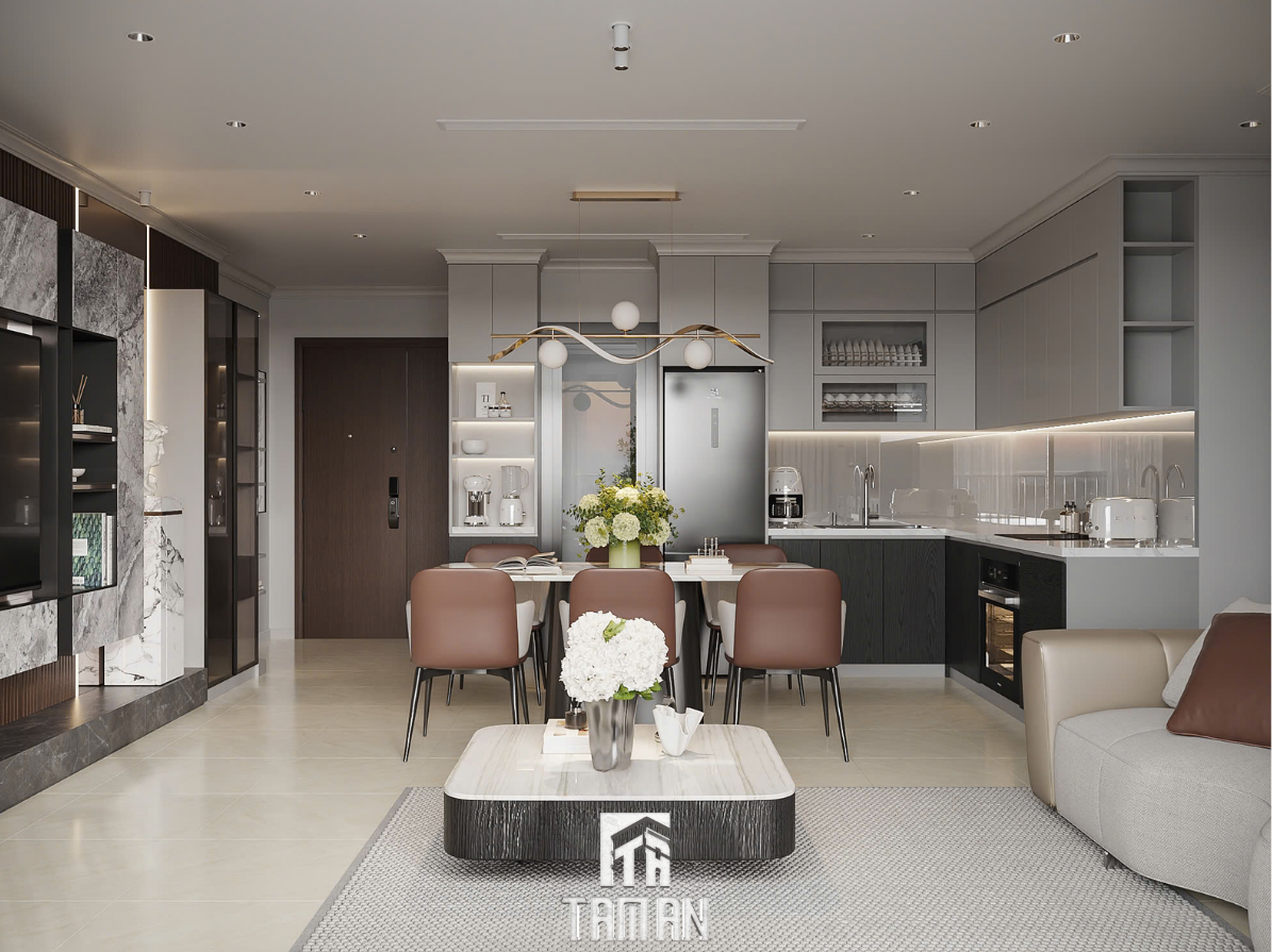 Ngay từ cái nhìn đầu tiên, tổng thể căn hộ tạo cảm giác thanh lịch và rộng mở nhờ cách sử dụng màu sắc trung tính như xám nhạt, be, trắng kem kết hợp hài hòa với ánh sáng tự nhiên và đèn chiếu sáng gián tiếp. Tường, trần và sàn đều tuân thủ cùng một tông màu nhẹ nhàng, mang lại hiệu ứng thị giác “nới rộng không gian”, đặc biệt phù hợp với căn hộ chung cư có diện tích vừa phải.