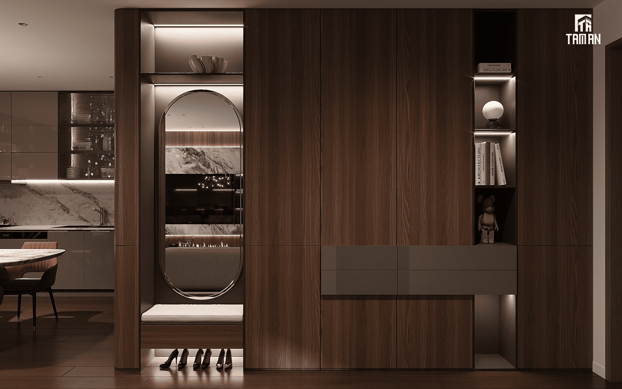 Chất liệu gỗ công nghiệp cao cấp với tông màu nâu trầm ấm được kết hợp khéo léo cùng đá marble và kính màu khói, tạo nên một bản phối vật liệu đầy chiều sâu. Khu vực phòng khách gây ấn tượng bởi sự tương phản nhẹ nhàng giữa vách đá trắng vân mây và hệ sàn gỗ tối màu, nơi ánh sáng từ hệ đèn LED profile không chỉ đóng vai trò chiếu sáng mà còn là đường dẫn định hình kiến trúc. Việc sử dụng các dải sáng giấu dây dọc theo các kệ trưng bày giúp không gian trở nên sống động và có hồn hơn.