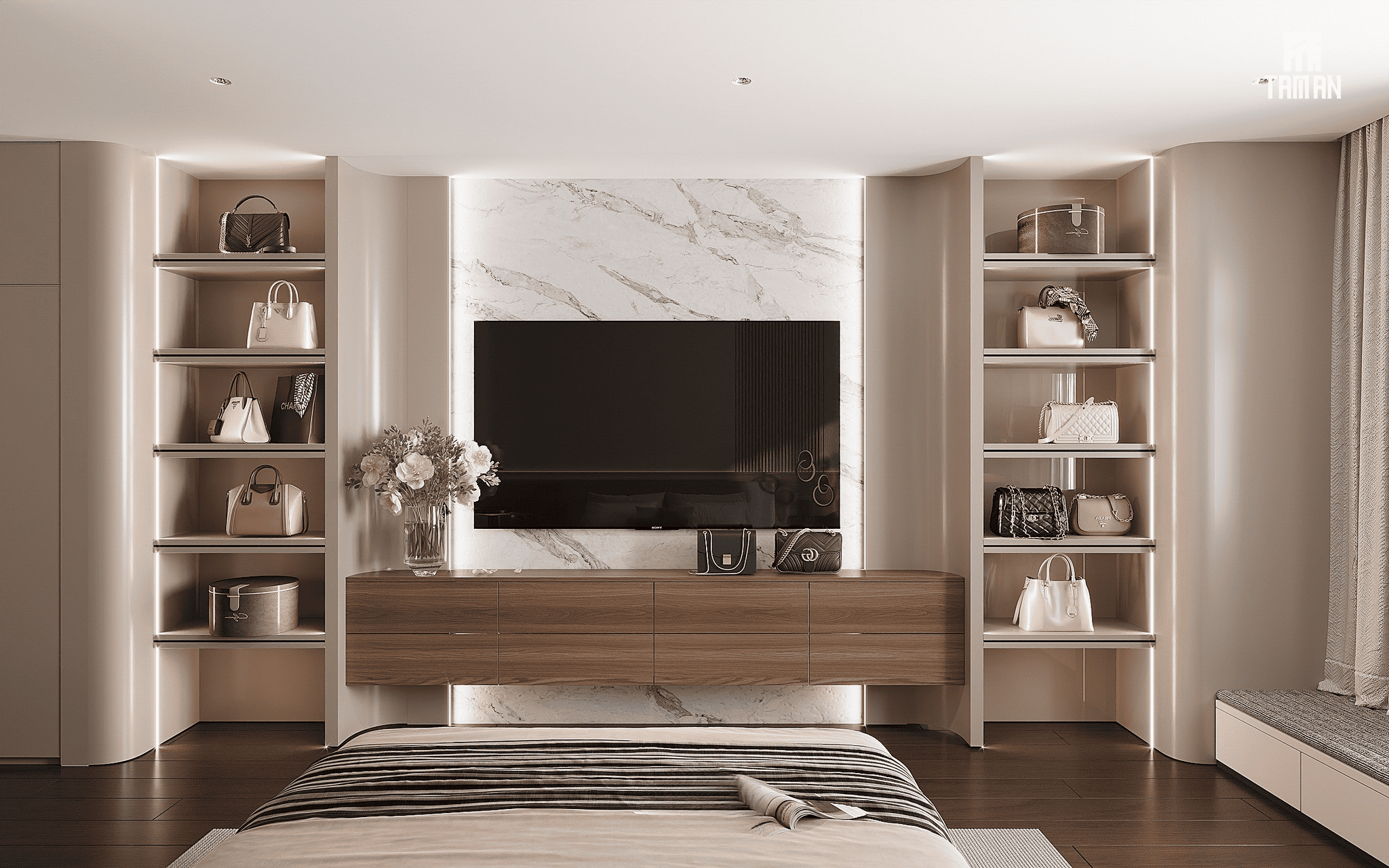 Trong khi đó, phòng ngủ lại là một bài toán về sự tĩnh lặng với hệ tủ trưng bày túi xách và phụ kiện được bố trí khoa học, sử dụng cửa kính màu để vừa bảo quản vừa tôn vinh giá trị sử dụng. Những đường bo cong mềm mại tại các góc tủ gỗ là chi tiết đắt giá, giúp làm dịu đi sự cứng cáp của các hình khối.
