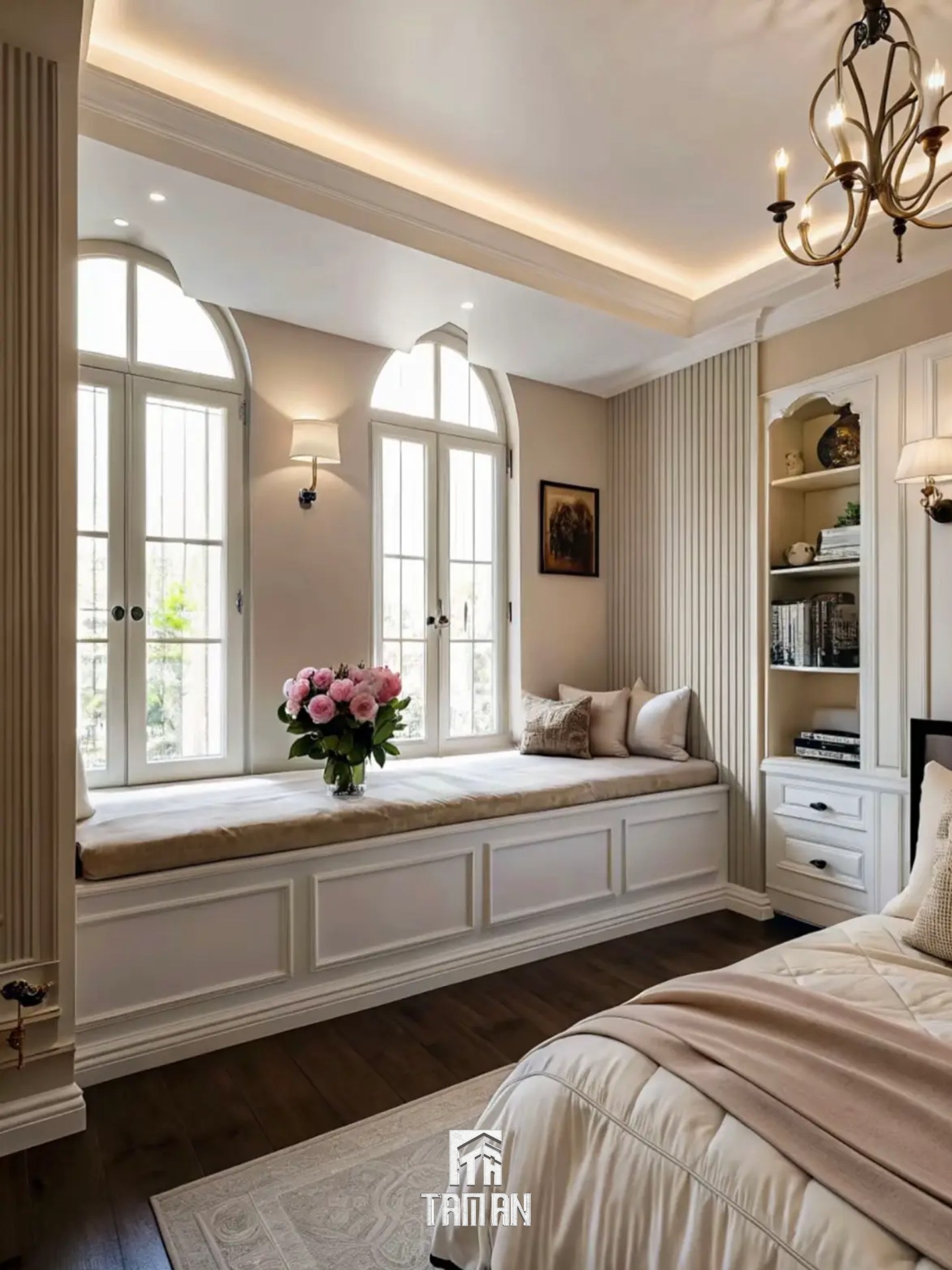 Bước vào không gian nội thất của ngôi nhà, cảm giác đầu tiên là sự thư thái được dệt nên từ những gam màu trung tính như kem, trắng sứ và be. Không đi sâu vào những chi tiết dát vàng lộng lẫy, nội thất ở đây chọn lối đi riêng với phong cách Tân cổ điển nhẹ nhàng. Sự sang trọng không đến từ sự phô trương mà hiện hữu trong cách xử lý phào chỉ tường mảnh mai, những đường cong bán nguyệt của khung cửa và sự kết nối mạch lạc giữa các khu vực chức năng.