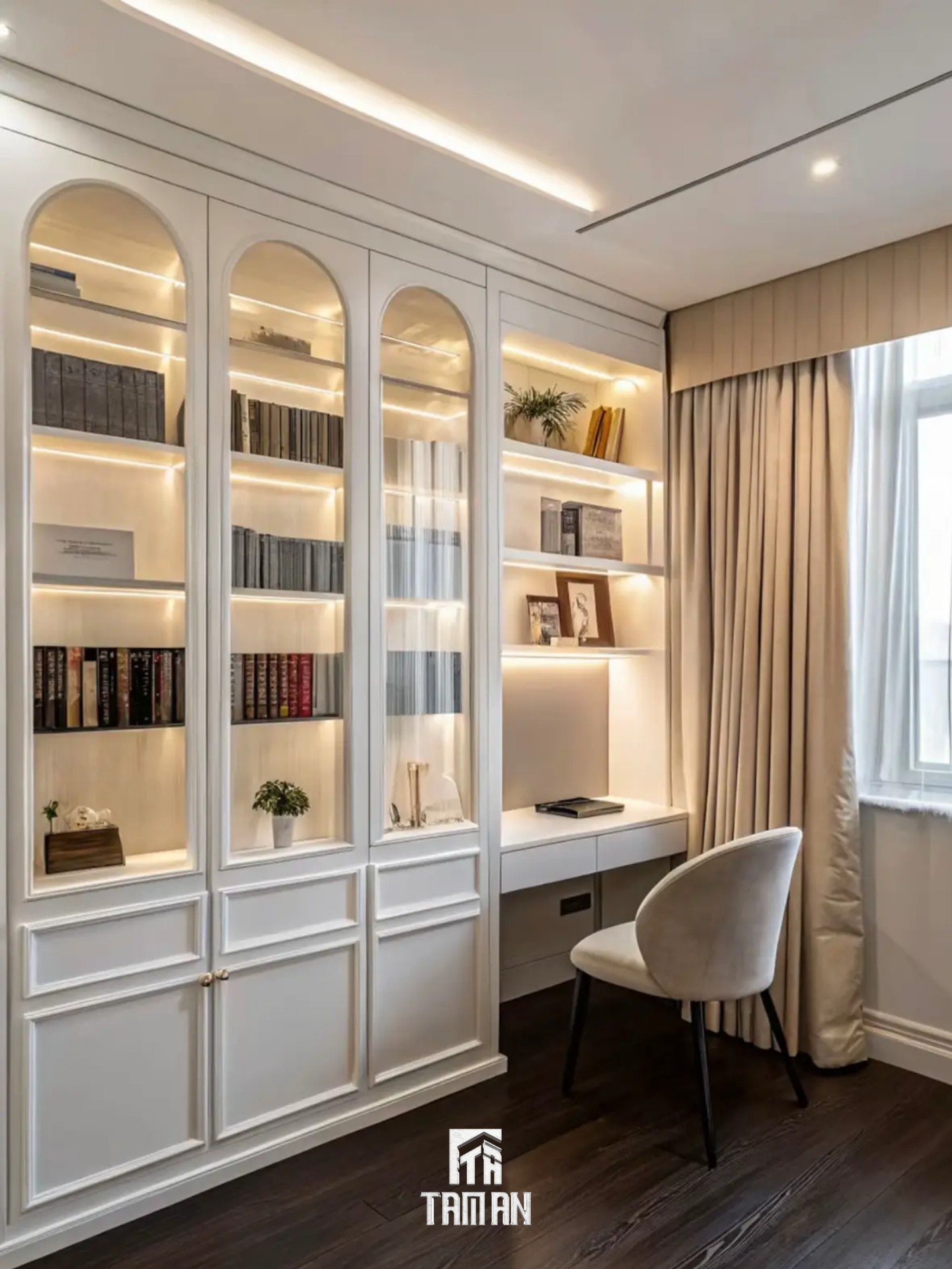 Sự chăm chút cho nội thất còn được đẩy lên cao trào trong các không gian thư giãn cá nhân như góc đọc sách hay phòng ngủ. Tận dụng ánh sáng tự nhiên từ những ô cửa lớn, các kiến trúc sư đã khéo léo bố trí bệ ngồi bên cửa sổ kết hợp cùng hệ tủ sách kịch trần. Cách sắp đặt nội thất này không chỉ tạo ra một góc nghỉ ngơi riêng tư đầy chất thơ mà còn thể hiện cái tôi đầy tri thức của gia chủ. Từng món đồ nội thất nhỏ như chiếc đèn tường, bình hoa hay những bức tranh tối giản đều được chọn lọc kỹ lưỡng để hòa quyện vào bức tranh tổng thể.