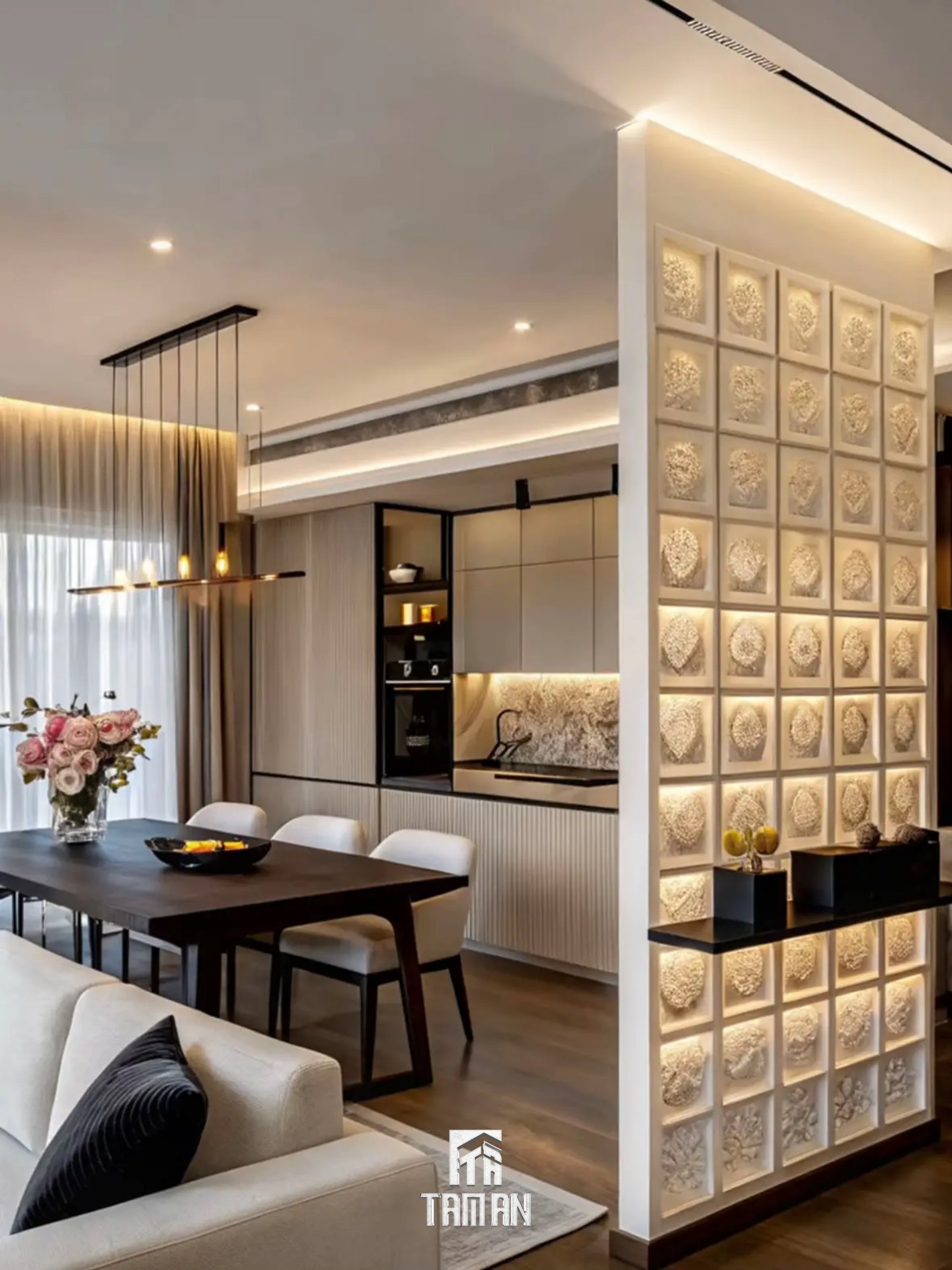 Khu vực bếp và phòng ăn lại là một minh chứng cho tư duy thiết kế nội thất hiện đại hóa truyền thống. Hệ tủ bếp kịch trần với các đường soi chỉ tinh tế giúp tối ưu diện tích nhưng vẫn giữ được vẻ đẹp thẩm mỹ cao. Điểm nhấn đặc biệt chính là sự xuất hiện của các vách ngăn nghệ thuật và hệ tủ rượu cánh kính, nơi ánh sáng từ bên trong hắt ra làm rạng rỡ những vật dụng nội thất bằng thủy tinh và kim loại, biến những bữa ăn gia đình trở thành trải nghiệm tại các nhà hàng cao cấp.