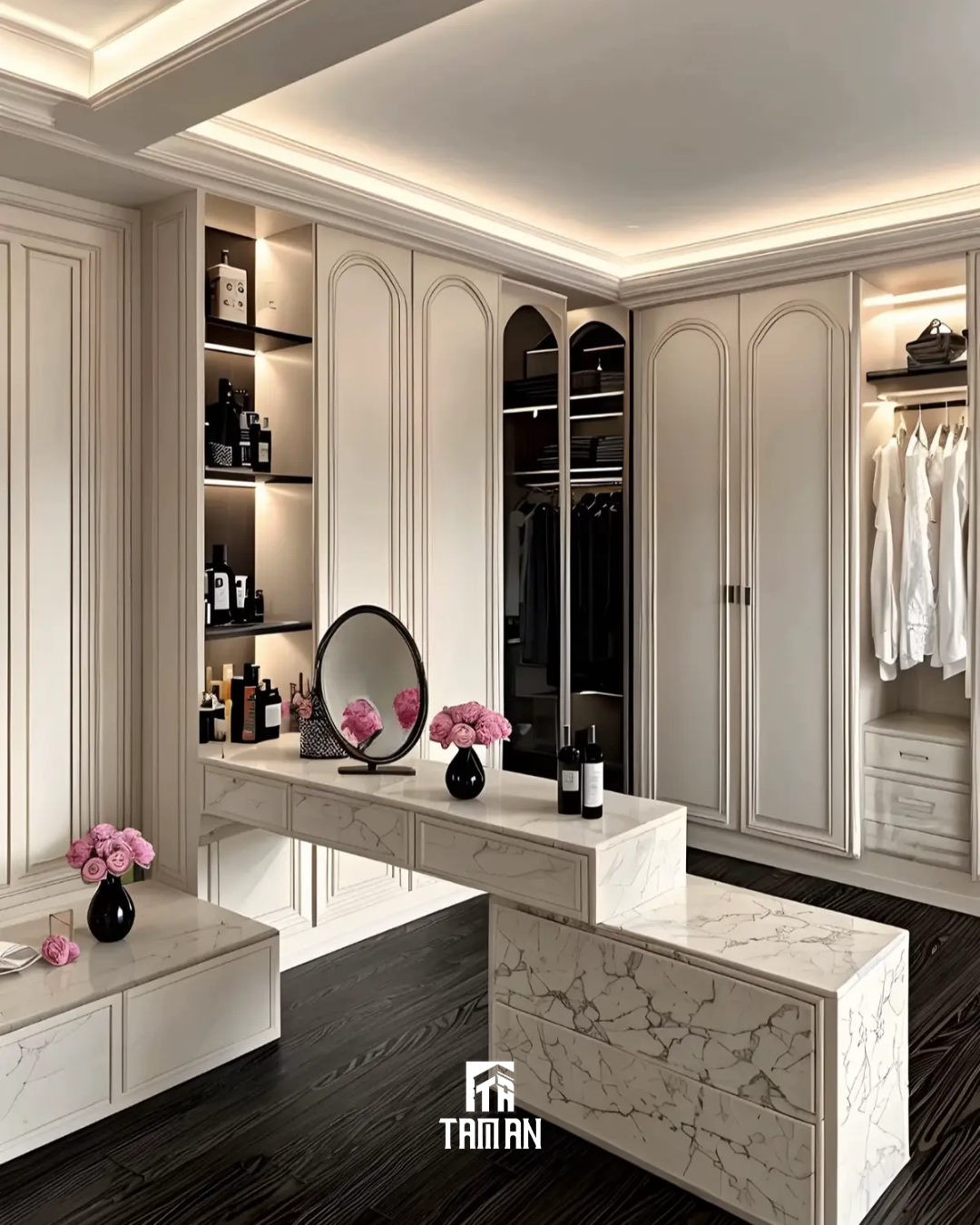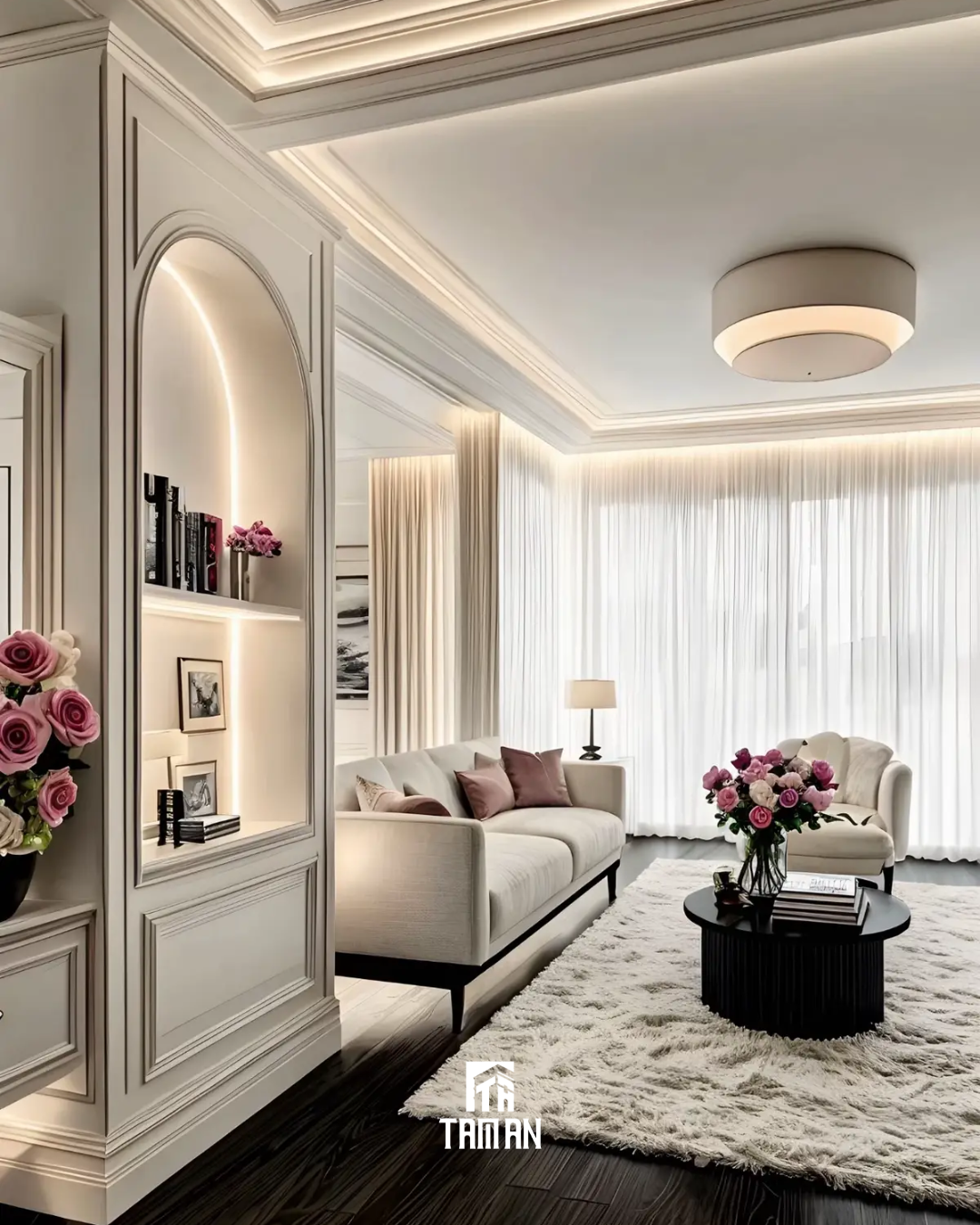 Bước vào phòng khách, ta lập tức bị thu hút bởi sự đối xứng tuyệt đối—một chuẩn mực khắt khe của nội thất Tân cổ điển. Hệ vách tivi được cách điệu theo dạng vòm cong, kết hợp cùng đèn LED hắt khe tạo nên độ sâu kỳ ảo cho mảng tường chính. Các món đồ nội thất từ sofa nỉ cao cấp đến bàn trà kim loại đều mang tông màu trung tính, tạo nên sự đồng nhất. Điểm xuyết trong bức tranh tinh khôi đó là những bình hoa hồng rực rỡ, một chi tiết decor đắt giá mang lại hơi thở sức sống và sự lãng mạn đặc trưng cho phong cách nội thất của ngôi nhà.