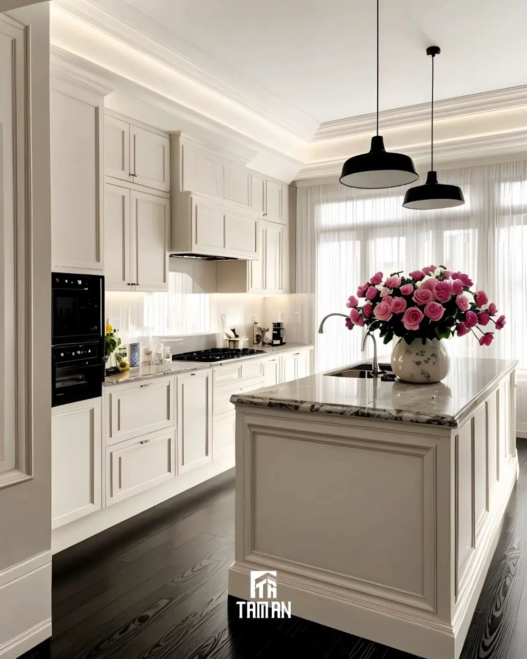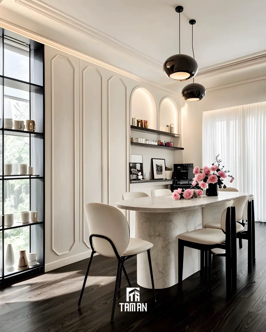 Sự tinh tế tiếp tục lan tỏa đến khu vực bếp và phòng ăn thông qua cách xử lý nội thất thông minh. Đảo bếp ốp đá Marble trắng vân mây không chỉ đóng vai trò là nơi chuẩn bị món ăn mà còn là vách ngăn hờ đầy thẩm mỹ. Các hệ tủ bếp kịch trần với tay nắm đồng sang trọng được sắp đặt khoa học, giấu trọn các thiết bị hiện đại sau những cánh cửa phẳng tinh giản. Tại đây, ánh sáng từ hệ đèn thả trần nghệ thuật hòa quyện cùng ánh sáng tự nhiên, làm rạng rỡ những bộ bát đĩa và ly tách, biến không gian ẩm thực thành nơi hưởng thụ vẻ đẹp nội thất đẳng cấp mỗi ngày.