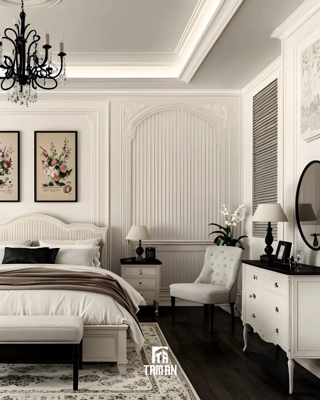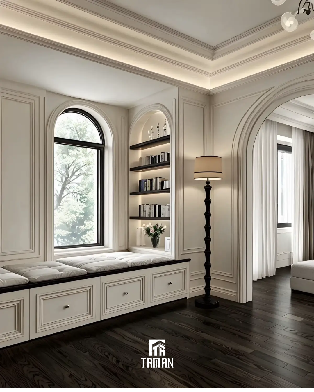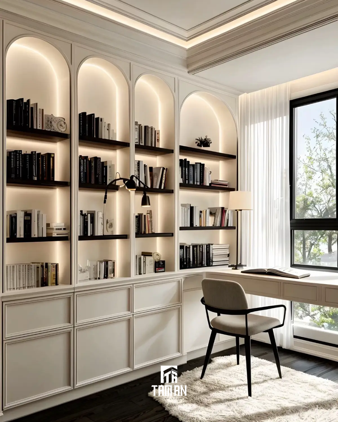 Không gian riêng tư như phòng ngủ và phòng làm việc lại là một bản phối khác của sự tĩnh tại. Thiết kế nội thất tập trung vào trải nghiệm cá nhân với hệ giường bọc nệm đầu giường hình quả trám và rèm cửa voan mềm mại. Điểm đặc biệt nhất chính là hệ tủ sách kịch trần kết hợp cùng bệ ngồi window seat bên khung cửa sổ vòm—một góc nhỏ lý tưởng để chủ nhân tách biệt khỏi nhịp sống hối hả. Từng món đồ nội thất nhỏ nhất đều tuân thủ nguyên tắc: sang trọng nhưng không phô trương, tinh tế nhưng đầy công năng, kiến tạo nên một tổng thể nội thất di sản trường tồn cùng thời gian.