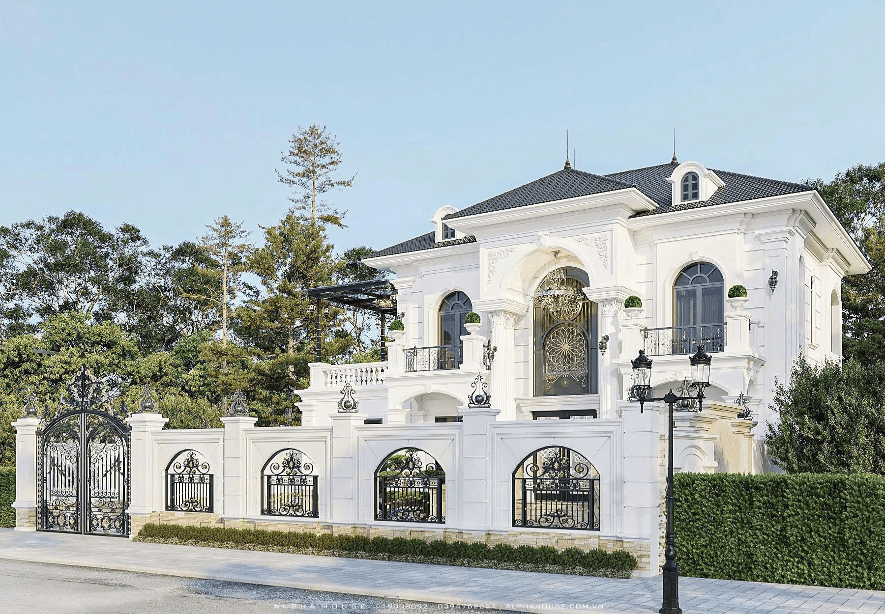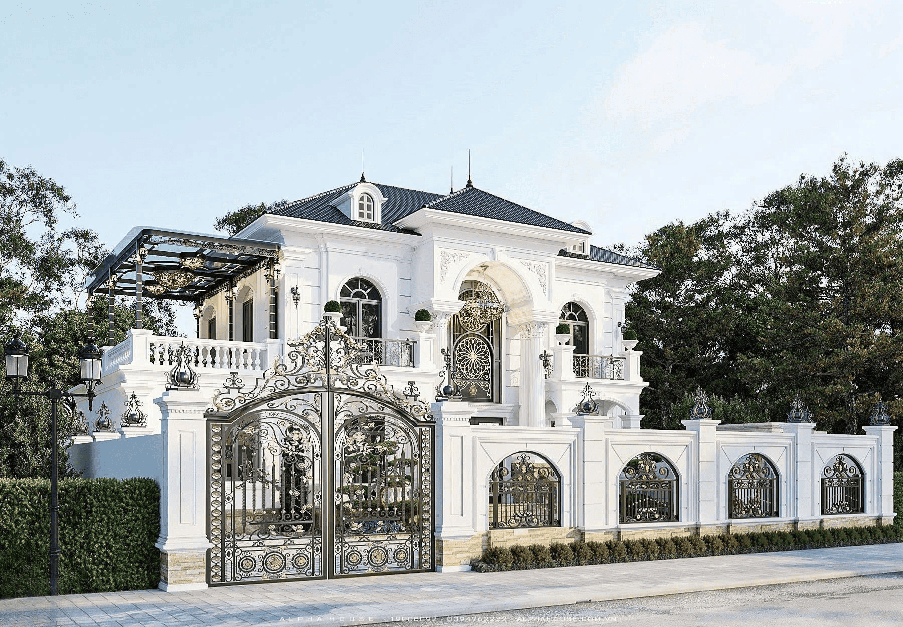 Kiến trúc của ngôi nhà ưu tiên tối đa việc kết nối với thiên nhiên. Hệ cửa vòm cao với chất liệu kính cao cấp giúp tối ưu hóa nguồn ánh sáng tự nhiên, khiến không gian bên trong luôn thoáng đãng và tràn đầy sinh khí. Sự xuất hiện của sắt nghệ thuật uốn lượn tại khu vực ban công và cổng chính tạo nên điểm nhấn mềm mại, đối lập hài hòa với sự vững chãi của khối nhà chính.