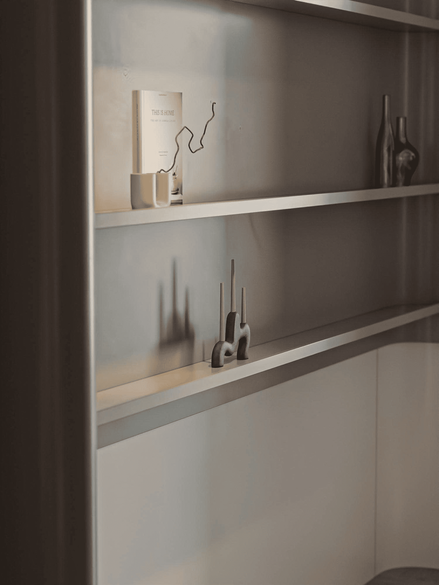 Ánh sáng được tính toán theo lớp một cách chuyên nghiệp. Thay vì chỉ sử dụng đèn chiếu sáng tổng thể, kiến trúc sư đã lồng ghép các dải đèn ray nam châm trên trần và đèn hắt trong các hốc tủ trưng bày. Cách làm này không chỉ làm nổi bật các món đồ decor nghệ thuật như tượng chim tối giản hay những cuốn sách kiến trúc, mà còn cho phép gia chủ thay đổi ánh sáng tùy theo tâm trạng và thời điểm trong ngày.