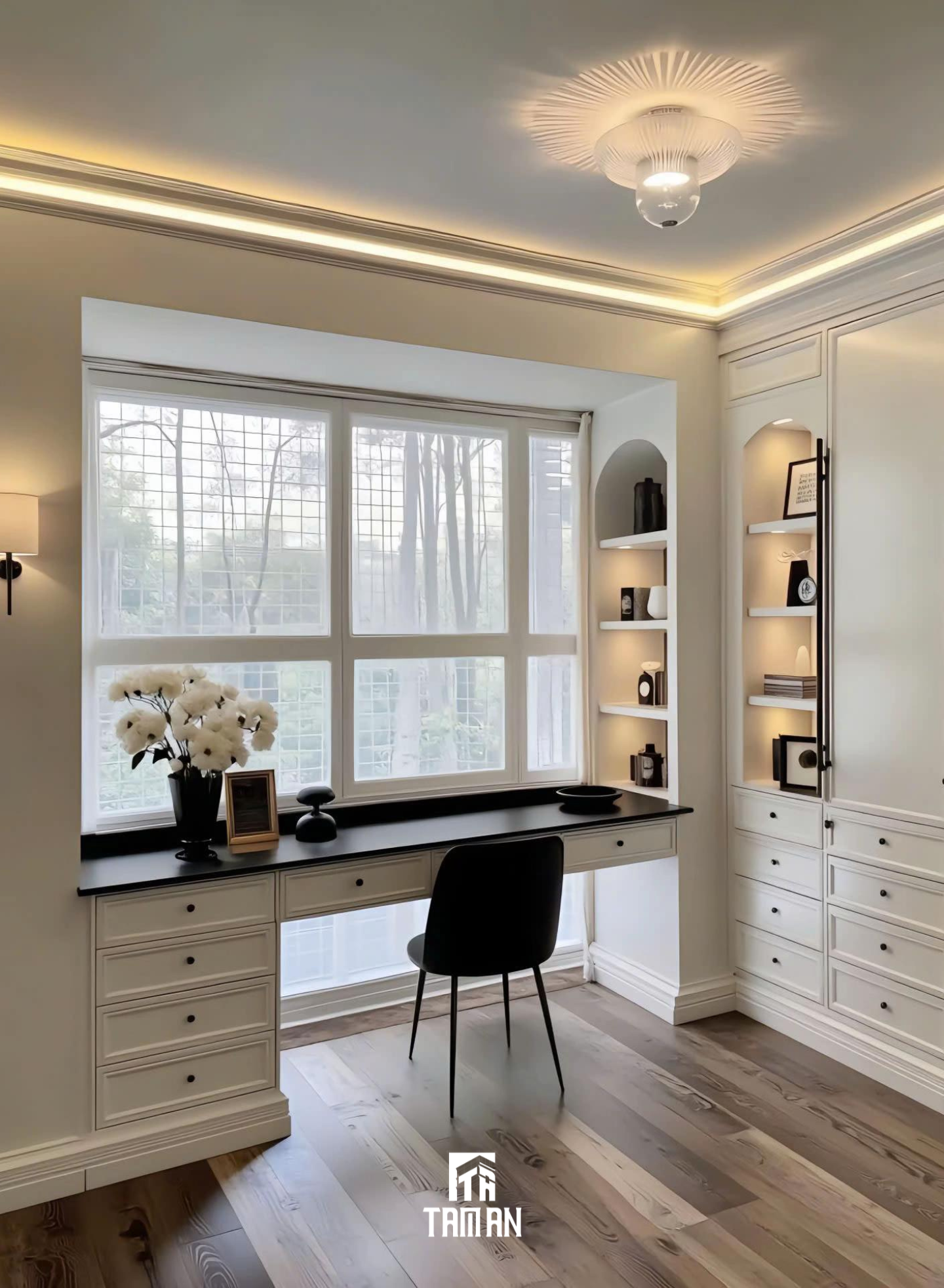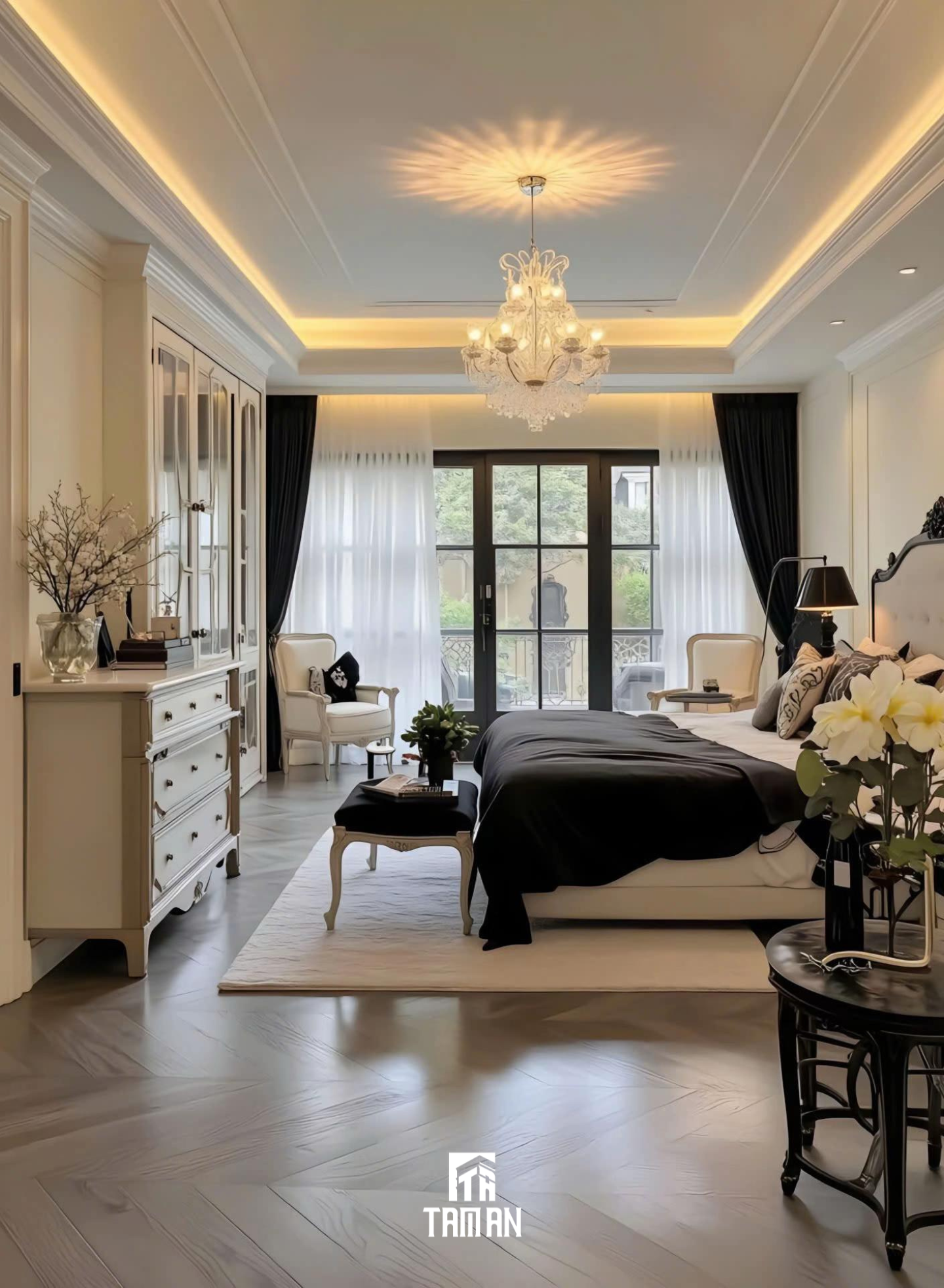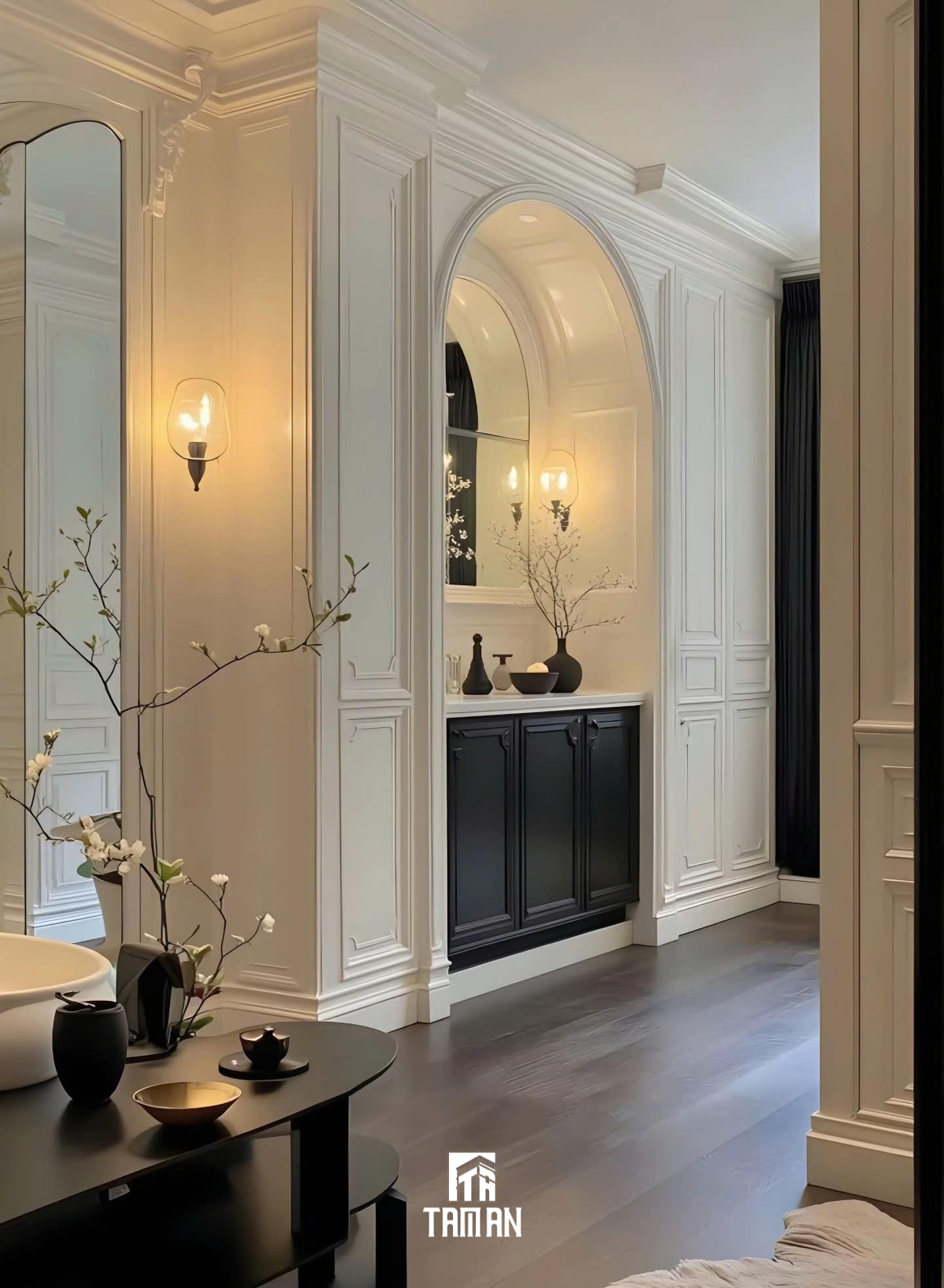 Cuối cùng, hệ thống ánh sáng đa tầng với các dải LED âm và đèn rọi điểm đã hoàn thiện bức tranh không gian đầy nghệ thuật. Dưới sự tính toán kỹ lưỡng, ánh sáng không chỉ làm nhiệm vụ chiếu sáng mà còn tôn vinh các khối kiến trúc và vật liệu, khẳng định giá trị bền vững của phong cách thiết kế nội thất tân cổ điển theo thời gian.