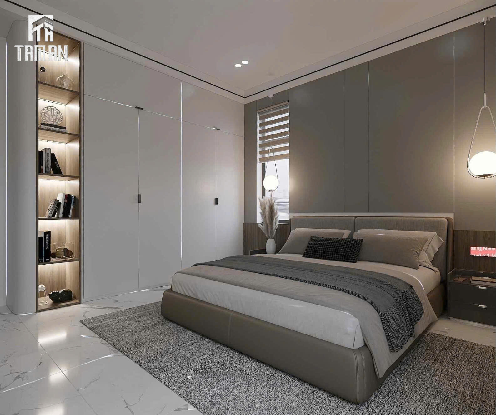 - Không gian phòng ngủ được thiết kế theo phong cách hiện đại tối giản, tập trung vào sự tinh tế trong đường nét và cảm giác thư giãn tuyệt đối cho gia chủ.✨ Tổng thể không gianBố cục gọn gàng, cân đối với gam màu trung tính nhẹ nhàng, tạo nên không gian yên tĩnh, dễ chịu và rất thoáng đãng.