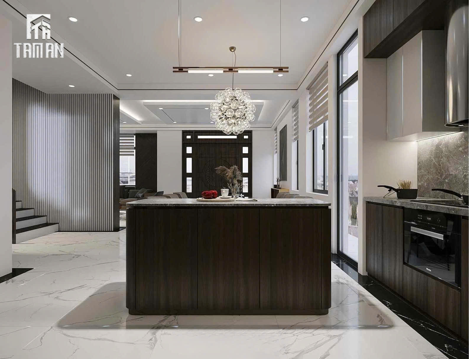 • Đảo bếp lớn tích hợp bồn rửa và không gian lưu trữ tiện dụng
