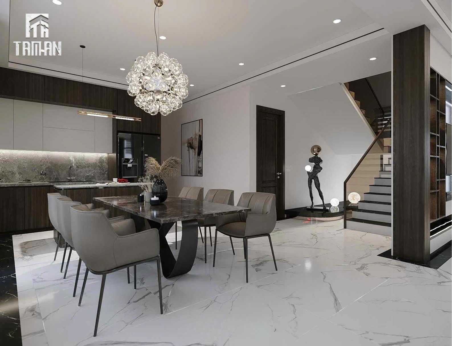 - Không gian bếp và phòng ăn được thiết kế theo phong cách hiện đại cao cấp, nổi bật với gam màu trung tính sang trọng, vật liệu đá marble kết hợp gỗ công nghiệp cao cấp, mang đến vẻ đẹp thanh lịch và tiện nghi vượt trội.✨ Tổng thể không gianThiết kế mở liên thông giữa bếp và khu vực bàn ăn giúp tối ưu diện tích sử dụng, tạo cảm giác rộng rãi, thông thoáng và kết nối sinh hoạt gia đình.