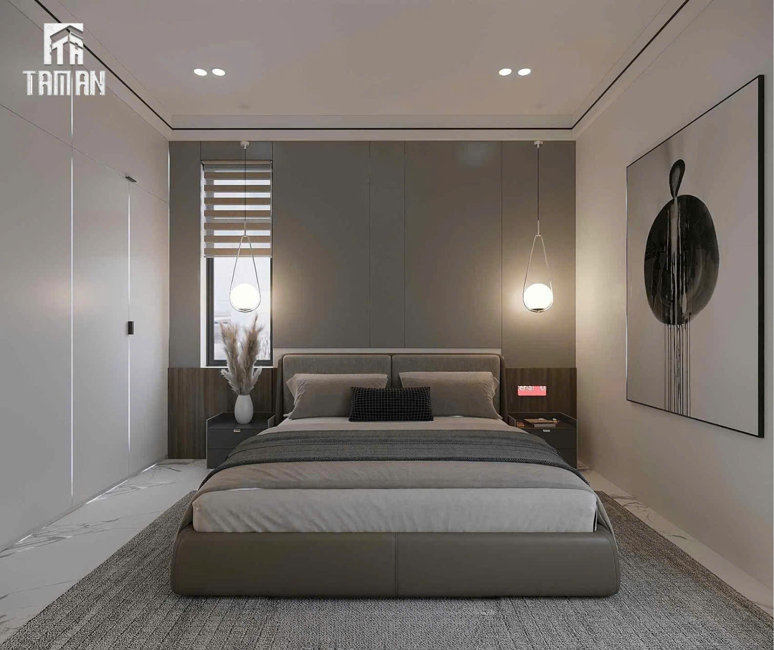 • Tường đầu giường ốp panel phẳng tinh tế, tạo chiều sâu không gian