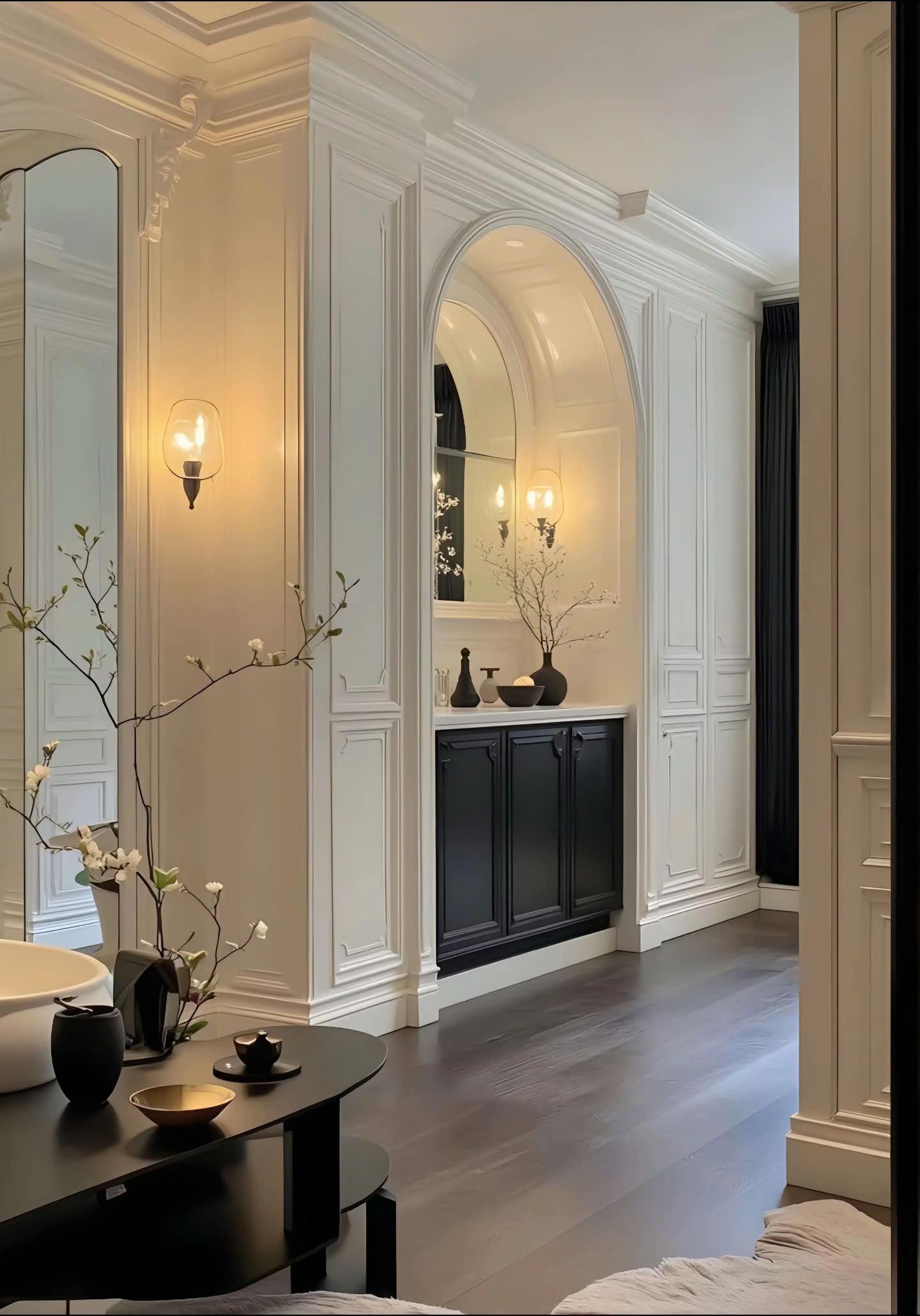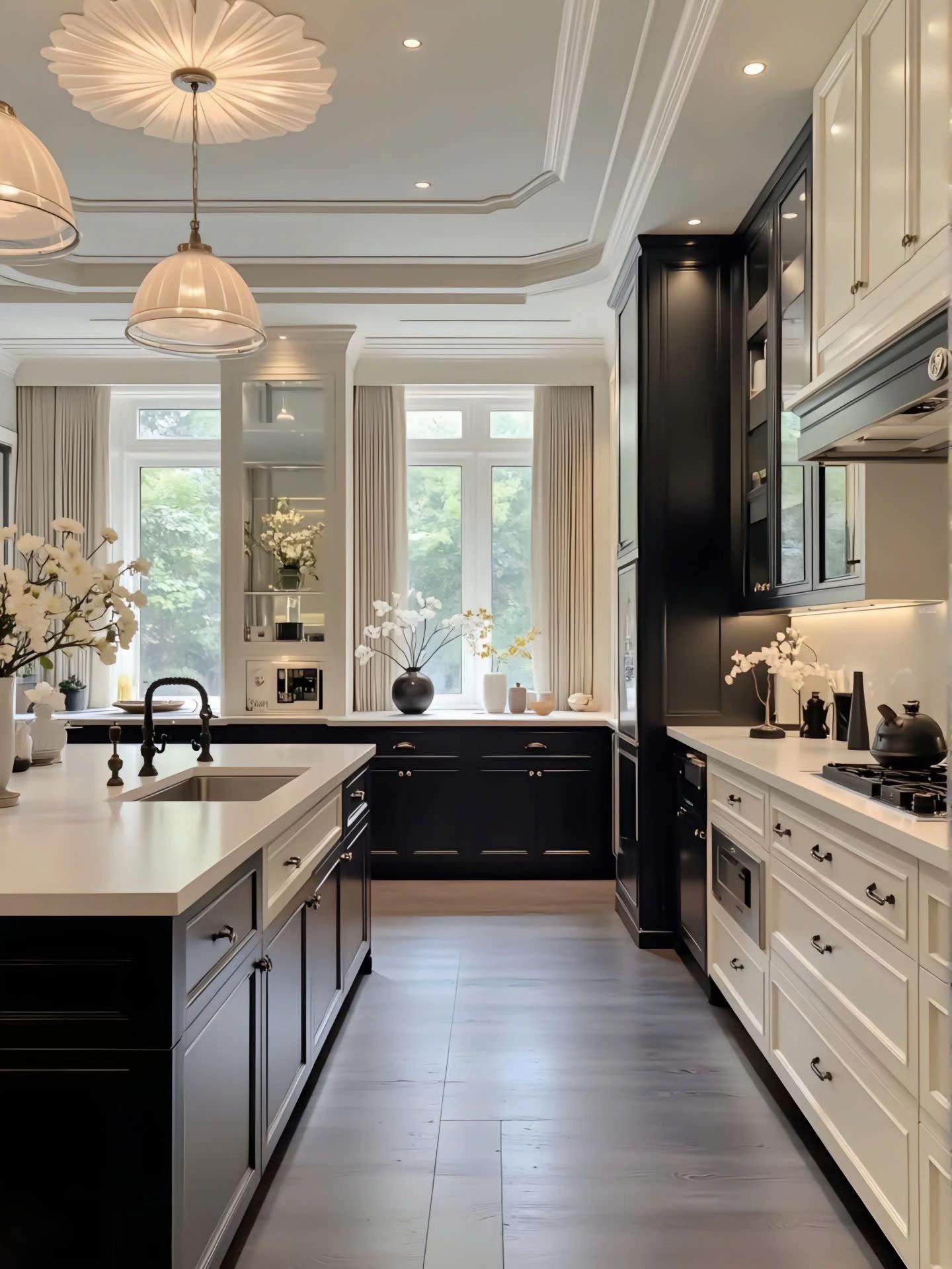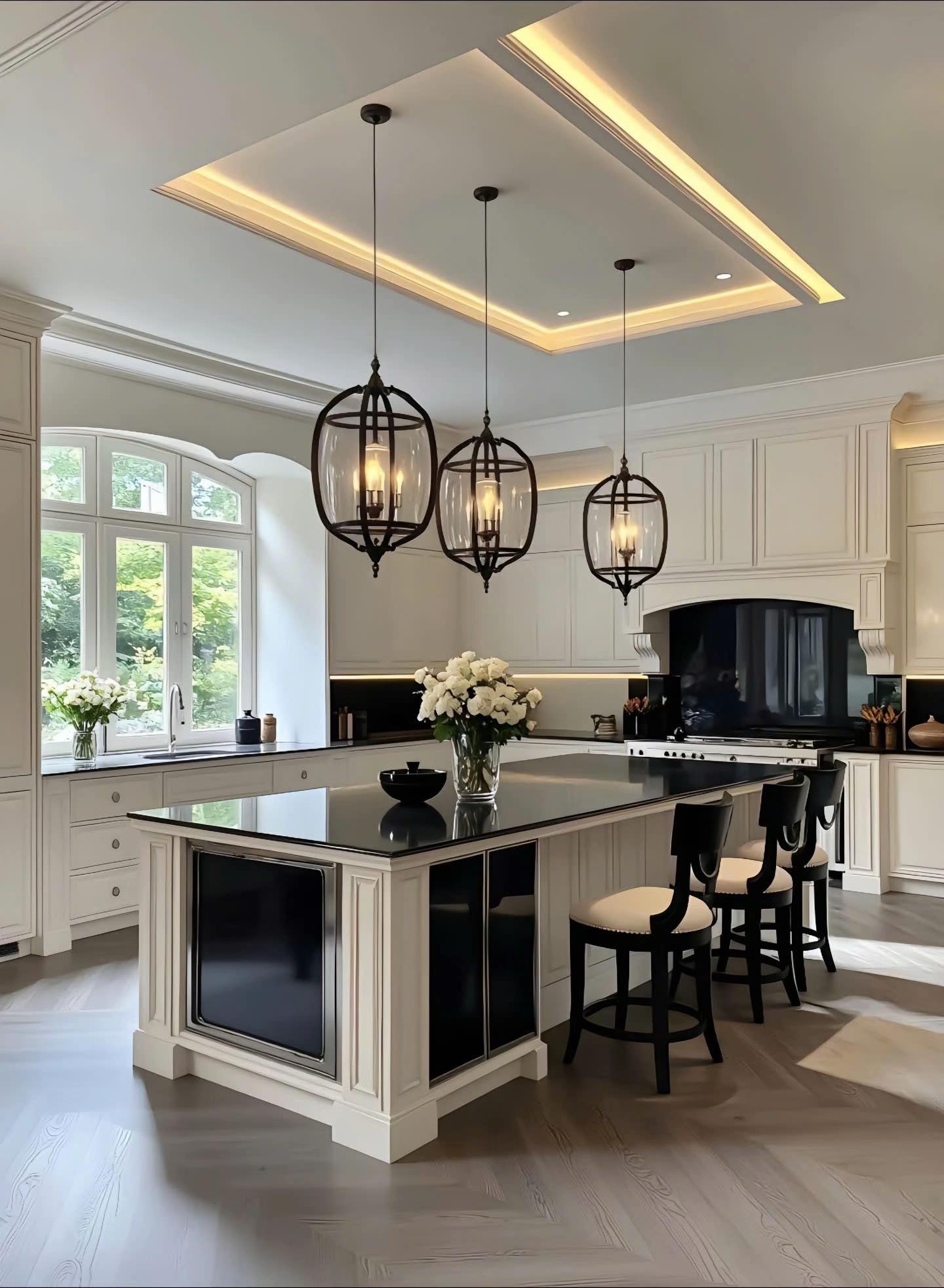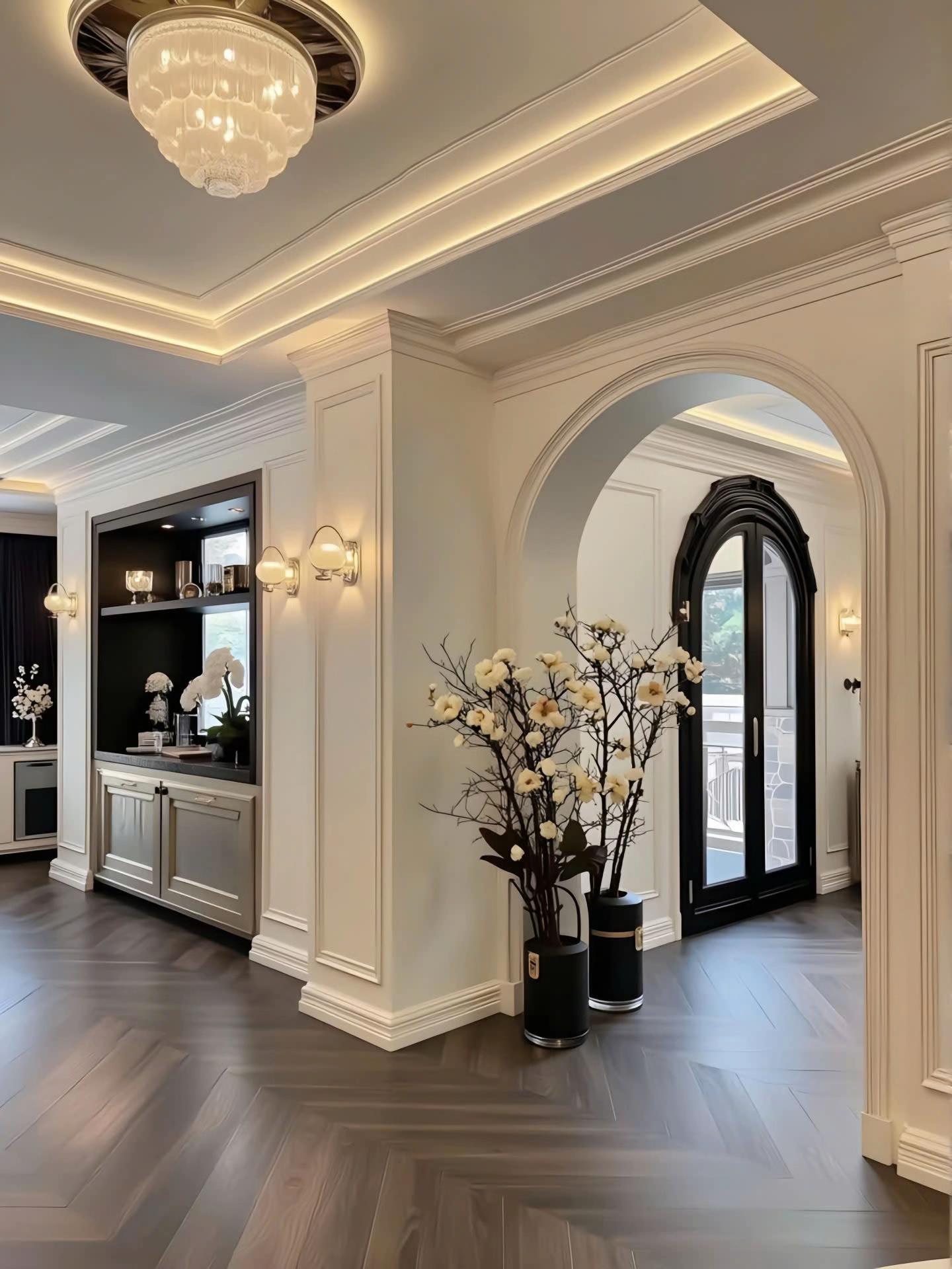 Điểm nhấn kiến trúc đắt giá nhất là hệ thống trần giật cấp tinh xảo, kết hợp đèn LED dây hiện đại tạo hiệu ứng ánh sáng ấm áp, làm tôn lên vẻ đẹp vương giả của chiếc đèn chùm pha lê lớn. Bảng màu trung tính với sự phối hợp kinh điển giữa trắng kem, ghi xám và các chi tiết đen mờ từ hệ tủ bếp, khung cửa mang lại cảm giác quyền lực, sang trọng nhưng không kém phần đương đại. Sự đối xứng trong bố cục nội thất, từ cặp đèn tường đến cách sắp xếp lọ hoa, tạo nên sự cân bằng thị giác hoàn hảo và cảm giác bề thế cho không gian.