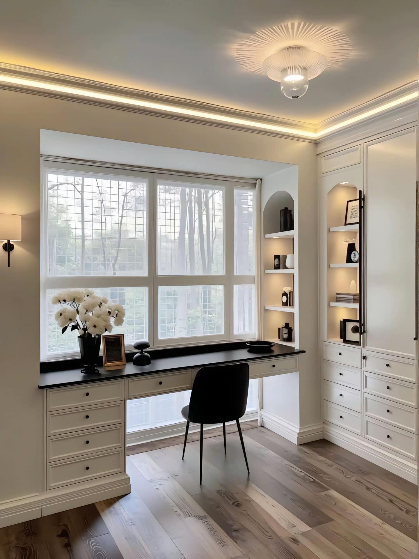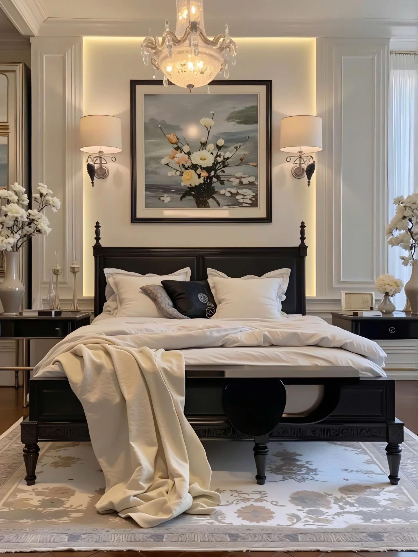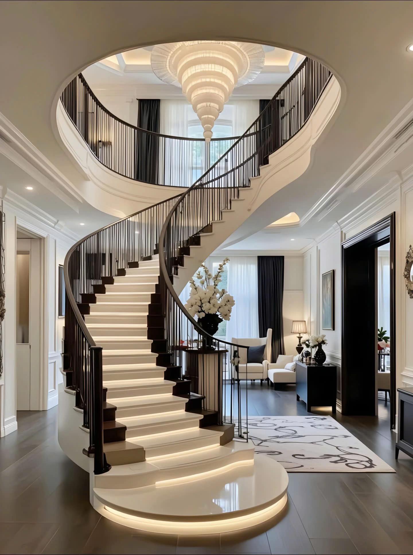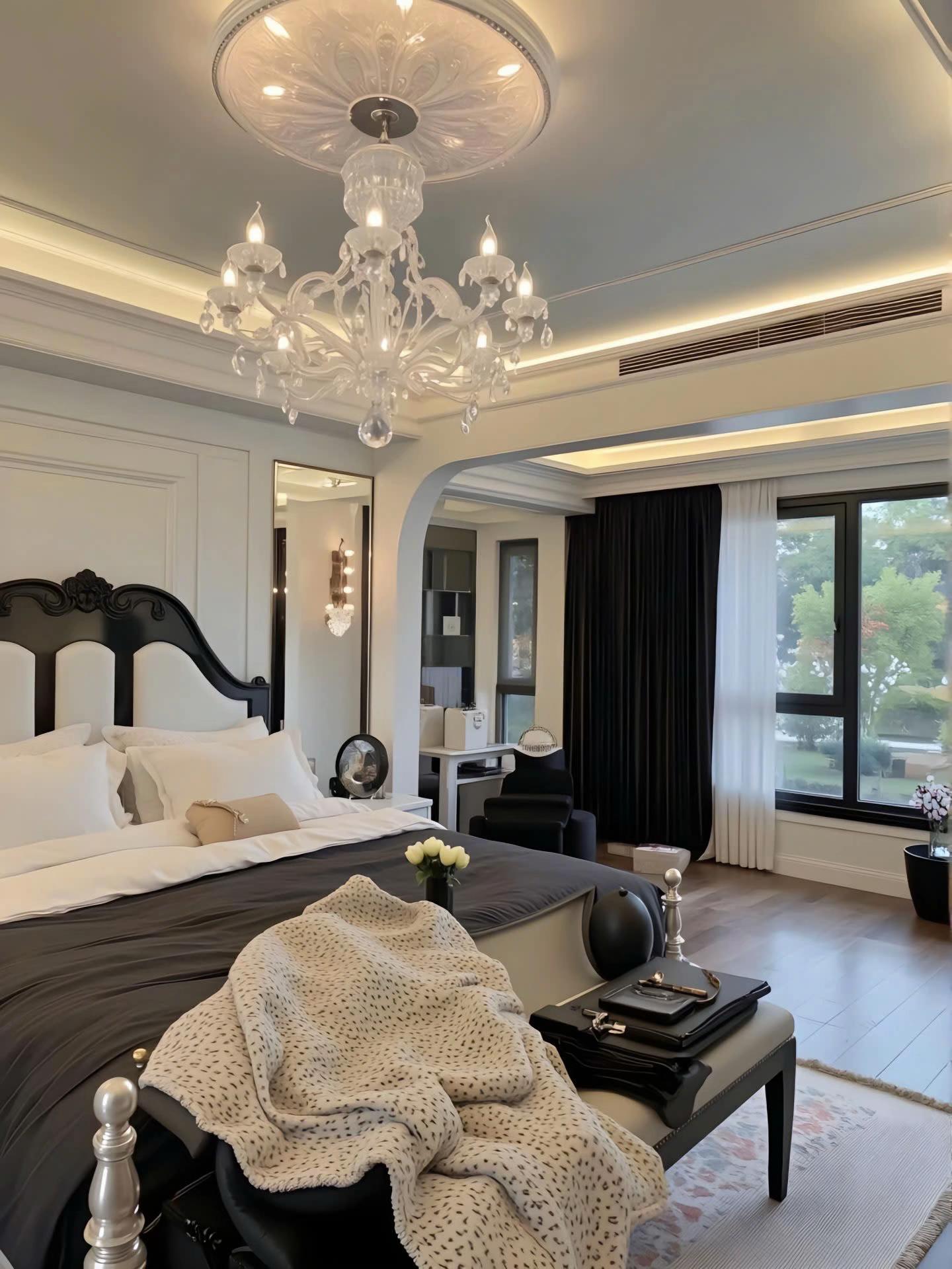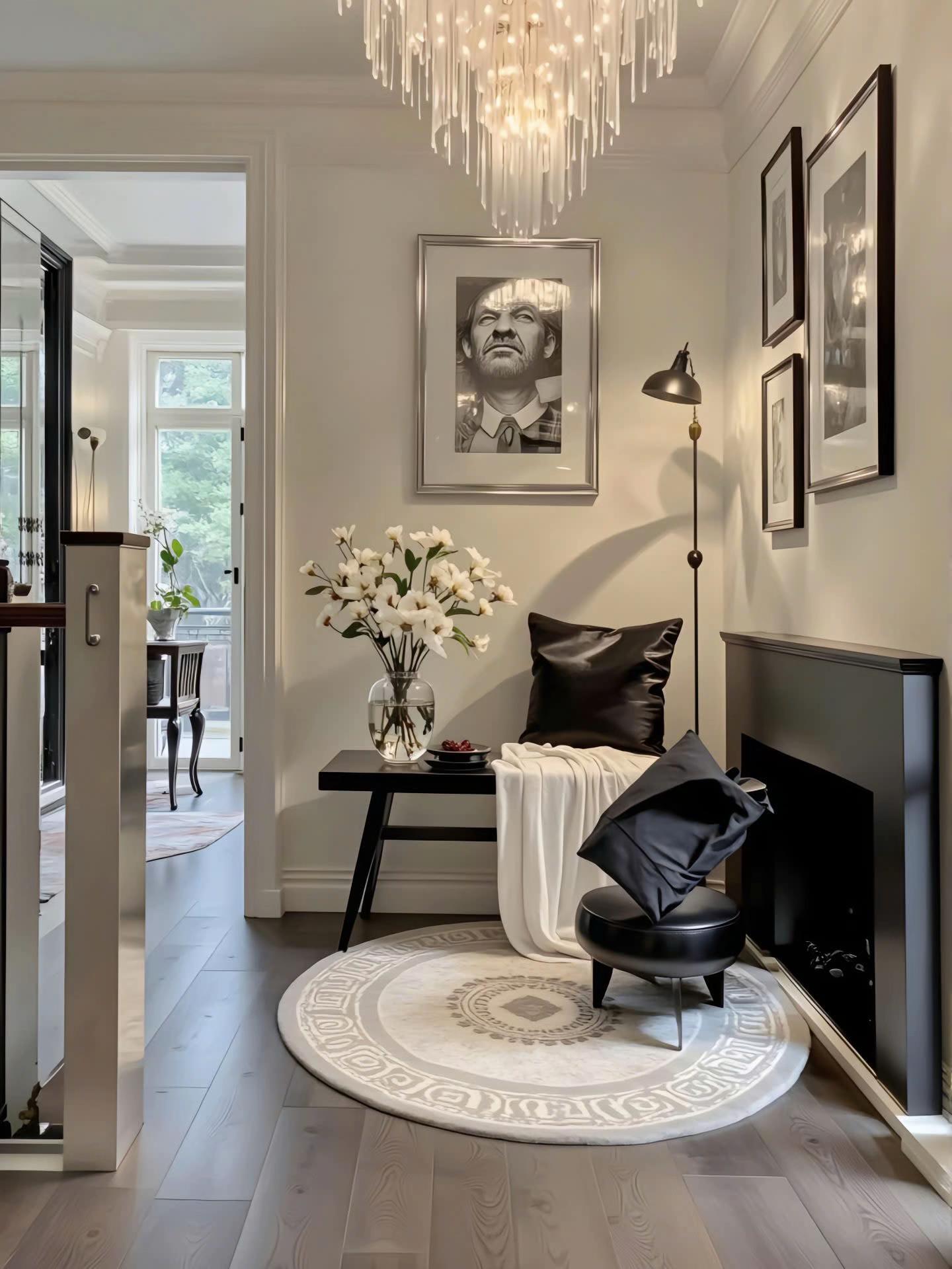 Điểm nhấn kiến trúc đắt giá nhất là hệ thống trần giật cấp tinh xảo, kết hợp đèn LED dây hiện đại tạo hiệu ứng ánh sáng ấm áp, làm tôn lên vẻ đẹp vương giả của chiếc đèn chùm pha lê lớn. Bảng màu trung tính với sự phối hợp kinh điển giữa trắng kem, ghi xám và các chi tiết đen mờ từ hệ tủ bếp, khung cửa mang lại cảm giác quyền lực, sang trọng nhưng không kém phần đương đại. Sự đối xứng trong bố cục nội thất, từ cặp đèn tường đến cách sắp xếp lọ hoa, tạo nên sự cân bằng thị giác hoàn hảo và cảm giác bề thế cho không gian.